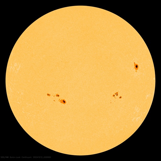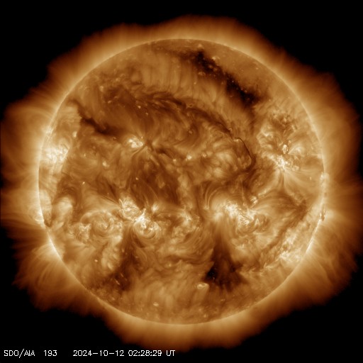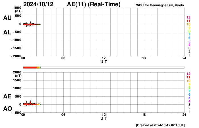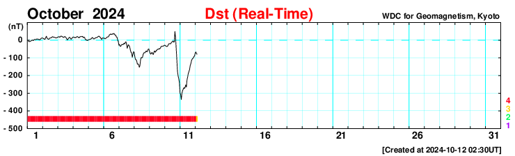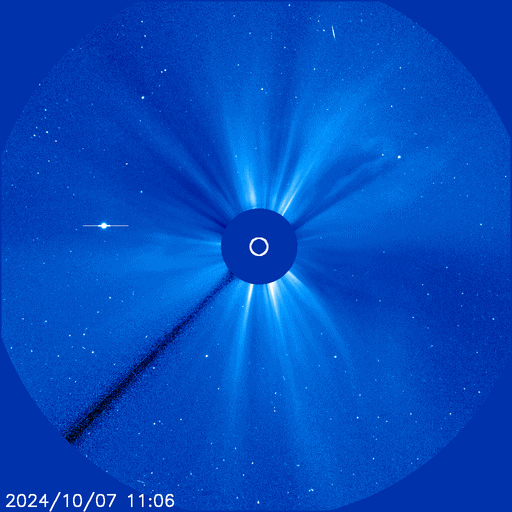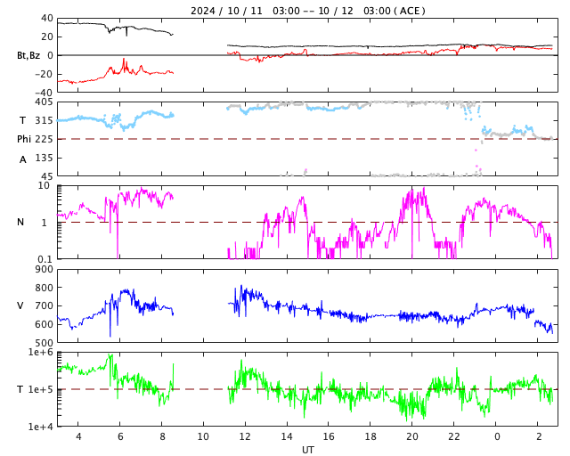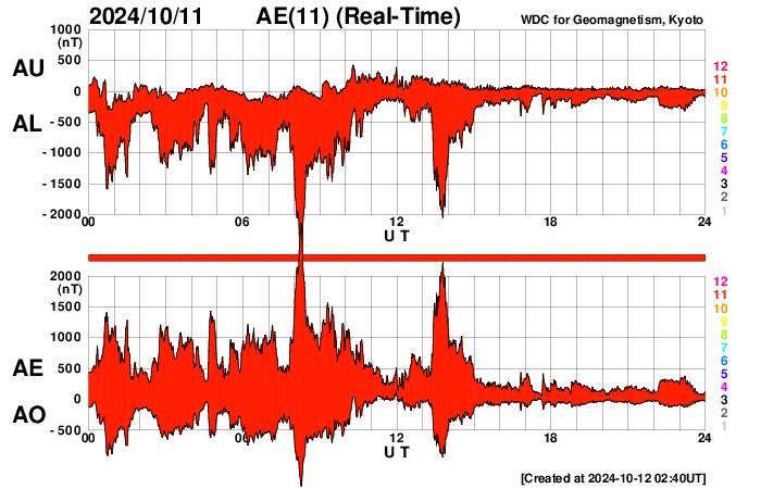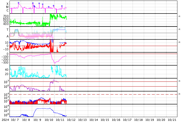 2024/10/12 11:53 更新 高速の太陽風は続いていますが、磁気圏は穏やかになっています。 担当 篠原 太陽風の強まりは続いています。 速度は、昨日のニュース以降も 650〜700km/秒と高速の状態が続いています。 一方、35nTに強まっていた磁場強度は、 昨夜には10nTまで下がり、現在もこの状態です。 磁気圏の激しい活動に繋がっていた太陽風磁場の南向きの強まりは、 昨夕、11日18時(世界時11日9時)頃に終わり、 以降は0nT付近、そして現在は北寄りに変わっています。 このため、磁気圏活動の強まりも昨夜で終わり、 AE指数は、11日22時半(世界時11日13時半)の 2000nTを超える激しい変化を最後に、 以降の変化は小さくなっています。 Dst指数も、11日10時台(世界時11日1時台)の-335nT以降、 11日18時台(世界時11日9時台)までは -250nTを超えるくらいの強まりが続いていましたが、 その後は値が上昇し、乱れの規模は小さくなっています。 結果として、日本では乱れが激しくなっていた時間帯が 11日の昼にあたっていしまいました。 乱れの到来のタイミングが半日ずれていたら、 全国でもっとすごい観測が行われていたのではないかと思います。 太陽は、中心部の3854黒点群で、 12日1時(世界時11日16時)に M2.1の中規模フレアが発生しています。 CME(コロナ質量放出)が太陽の左下に向かって飛び出しています。 太陽の中心に近いので、活動が続く場合は注意してください。 紫金山・アトラス彗星は、 SOHO衛星LASCO C3の画面を通り過ぎ、 尾だけが長く見えています。 この後は、西の夕空での観測報告が楽しみです。 (私も探してみたいです)