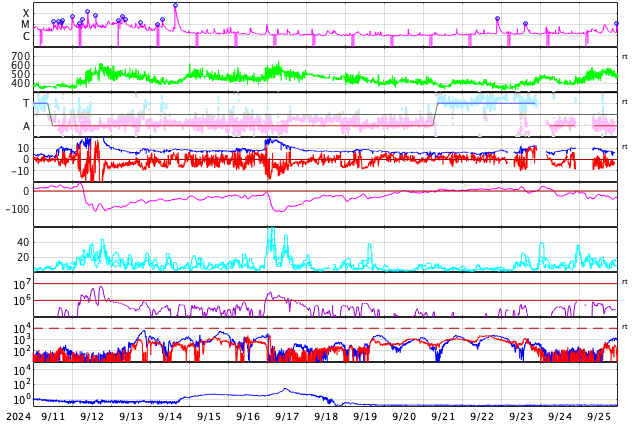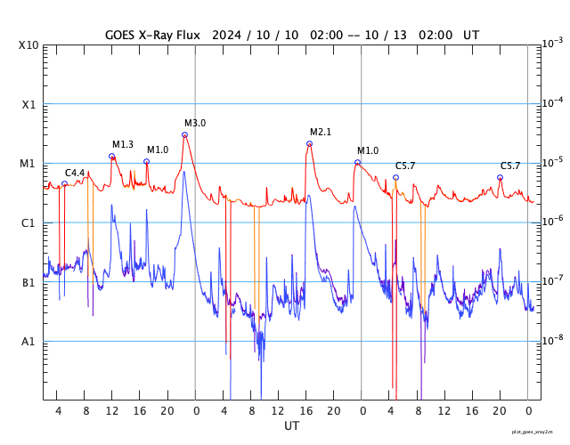 GOES衛星の太陽X線強度。赤・橙 = 0.1〜0.8 nm、青・紫 = 0.05〜0.4 nm (c) データ:NOAA/SWPC、作図:宇宙天気ニュース ![]() | |||||||||||||||||||||||||||||||||||||||||||||||||||||||||||||||||||||||||||||||||||||||||||||||||||||||||||||||||||||||||||||||||||||||||||||||||||||||||||||||||||||||||||||||||||||||||||||||||||||||||||||||||||||||||||||||||||||||||||||||||||||||||||||||||