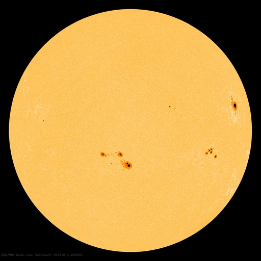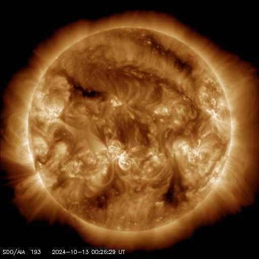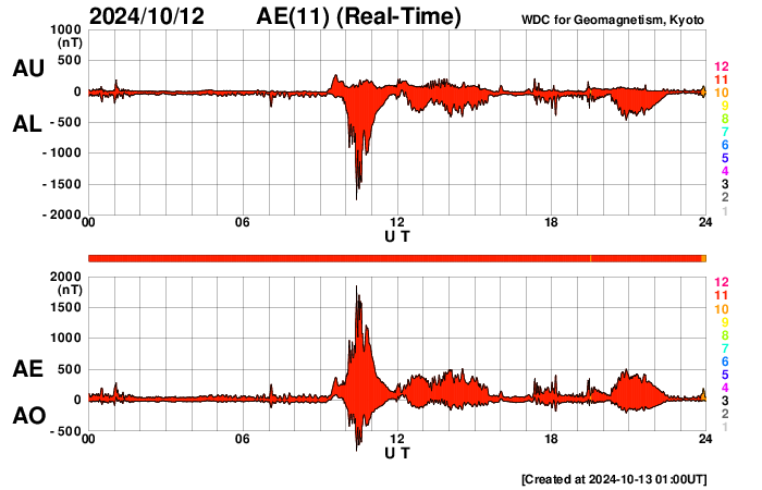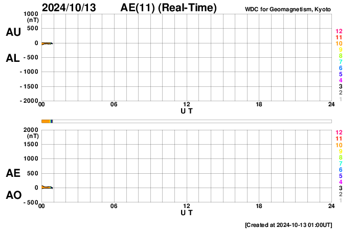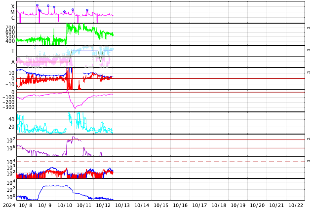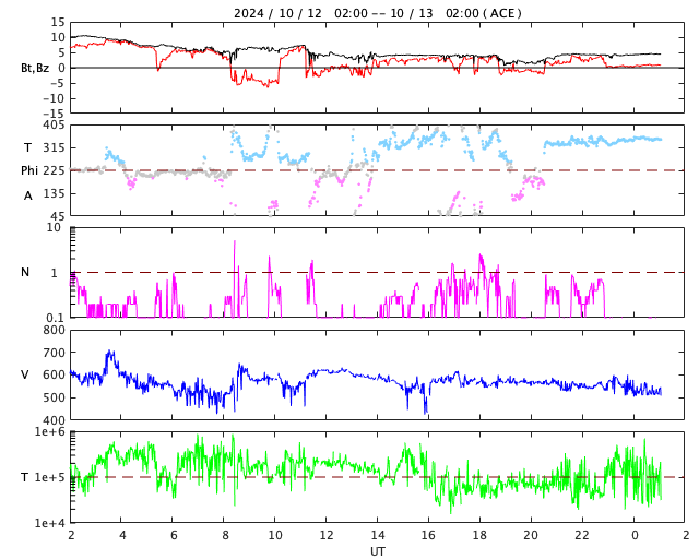 2024/10/13 10:11 更新 高速の太陽風が続いていますが、速度は次第に低下しています。 担当 篠原 太陽風の速度は、600km/秒から530km/秒へ次第に低下しています。 高速の状態は続いていますが、 速度の高まりは落ち着きつつあります。 磁場強度も10nTから4nTへ下がり、 こちらは平均的な値に戻っています。 太陽風磁場の南北成分は、北寄りの状態が続いています。 このため磁気圏は比較的穏やかに推移しています。 その中で、磁場が一時的に南向きに強まった時間帯があり、 AE指数に1800nTの激しい変化が発生しています。 この後、太陽風は穏やかな状態になりそうです。 太陽は、C4〜5台の小規模フレアが数回発生する程度で、 全体としては比較的穏やかに推移しています。 太陽の東側は黒点も少なく、 この後太陽はしばらく穏やかになるかもしれません。 紫金山・アトラス彗星は、 SOHO衛星LASCO C3では尾だけが残って見えていますが、 尾が太陽に近づいて来たため、 C2でも右上の方に微かに見えるようになっています。 昨夕には、各地で彗星が観測されている様です。 私も挑戦してみたいと思っています。