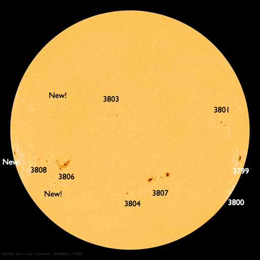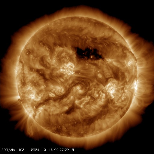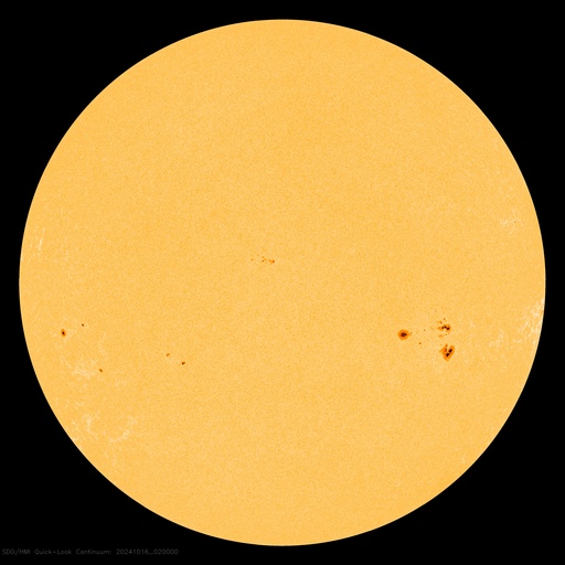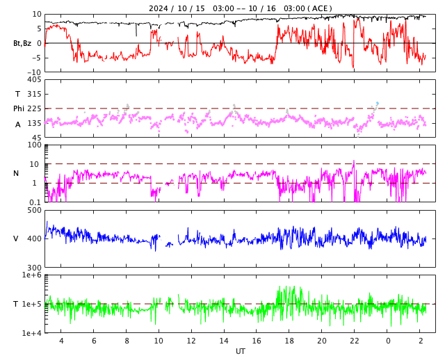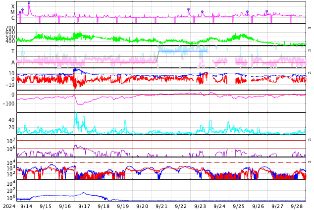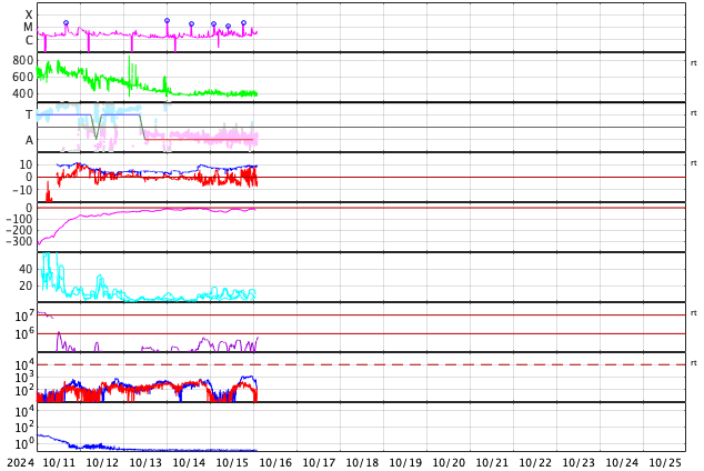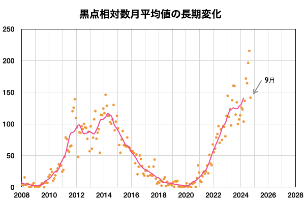 2024/10/16 11:40 更新 フレアの発生が増えています。9月の黒点相対数は 141.4 でした。 担当 篠原 10月も半分が過ぎて、随分遅れてしまいましたが、 WDC-SILSOによる9月の黒点相対数についてお知らせします。 月平均値は 141.4 と発表されました。 5月から8月にかけて、171.7、164.2、196.5、215.5と 高い値が続いていましたが、 4月の136.5以来となる150以下の値に下がっています。 それでも、1日値を見るとほとんどの日が100を超えていて、 2桁に下がったのは、15日の97だけでした。 可視光写真の動画では、ずっと黒点が現れ続けています。 グラフとしては、ピークを越えた形になりますが、 再び高まりはやって来るでしょうか。 紫金山・アトラス彗星は、 SOHO衛星LASCO C3で、尾の淡い層が画面の左下側に残っています。 昨日の夕方から今朝にかけて半日ほど画像が欠けていて、 動画が飛んでいるのが残念です。 残り数日だと思いますが、見えている限り追いかけようと思います。 昨日の昼以降、太陽の南西側(右下)の3852黒点群の活動度が上がり、 Cクラスの小規模フレアが次々に発生しています。 Mクラスに達する活動もあり、M1.1、M1.3が発生しています。 また、すぐとなりの3854群でも、 M2.1の中規模フレアが発生しています。 また、中心部北側(上側)の3856群で、 小さい活動が連続するようになっています。 活動の規模が大きくなる様であれば、注目して下さい。 太陽風は、速度は400km/秒と平均的な状態です。 磁場強度は、7nTから9nTに少し上がり、 やや強まった状態です。 磁場の南北成分は、 グラフの前半は南寄り、後半は南北に変化しています。 このため、AE指数は、 グラフの途中までは500〜800nTの中規模の変化が続きましたが、 その後は変化が小さくなって、現在は穏やかです。 SDO衛星AIA193では、 中心部の北側にコロナホールが見えています。 2日後くらいから、 太陽風速度の高まりがやって来るかもしれません。 ![]() 太陽黒点相対数の長期変化。9月の黒点相対数は 141.4 でした。 (c) 黒点データ:WDC-SILSO、作図:宇宙天気ニュース ![]() 1975年以降の太陽黒点相対数の長期変化。 (c) 黒点データ:WDC-SILSO、作図:宇宙天気ニュース ![]() 9月の太陽黒点の推移。SDO衛星。 (c) SDO衛星HMII (NASA)、(動画加工 : 宇宙天気ニュース) ![]() 紫金山・アトラス彗星の尾は、更に淡くなっています。 (c) SOHO衛星LASCO C3 (ESA & NASA)、(動画加工 : 宇宙天気ニュース) ![]() SDO衛星のAIA193カメラによる太陽コロナの様子 (c) SDO (NASA) ![]() SDO衛星による太陽の可視光写真。マウスの矢印を写真に重ねると、黒点番号付きの写真に切り替わります。 (c) SDO (NASA) ![]() GOES衛星の太陽X線強度。赤・橙 = 0.1〜0.8 nm、青・紫 = 0.05〜0.4 nm (c) データ:NOAA/SWPC、作図:宇宙天気ニュース ![]() ACEが観測した太陽風の磁場(黒線は全体の強度、赤線は南北成分) 磁場の向き、プラズマの密度、速度、温度 (c) データ:NOAA/SWPC、作図:宇宙天気ニュース ![]() AE指数(速報値) 下段のAEグラフの値が高くなると、オーロラ活動が活発化しています。 (c) 京都大学WDC ![]() ![]() 27日の太陽周期に合わせた図 太陽が同じ面を地球に向けていた27日前の変化から、今後を予想することができます。 (c) 作図:宇宙天気ニュース