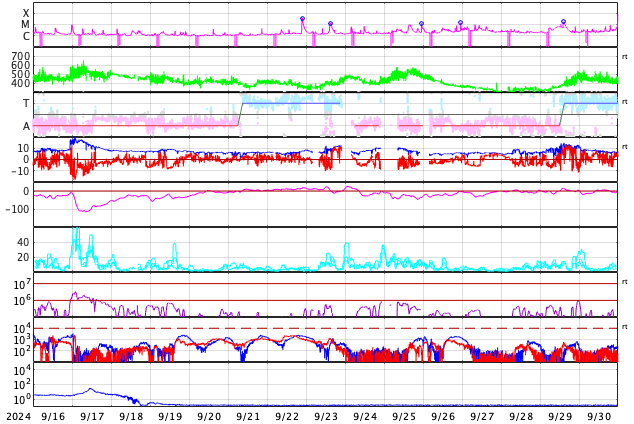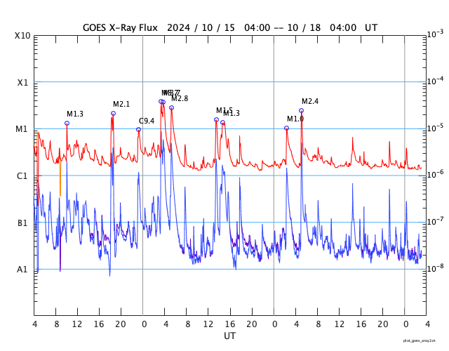 GOES衛星の太陽X線強度。赤・橙 = 0.1〜0.8 nm、青・紫 = 0.05〜0.4 nm (c) データ:NOAA/SWPC、作図:宇宙天気ニュース ![]() | |||||||||||||||||||||||||||||||||||||||||||||||||||||||||||||||||||||||||||||||||||||||||||||||||||||||||||||||||||||||||||||||||||||||||||||||||||||||||||||||||||||||||||||||||||||||||||||||||||||||||||||||||||||||||||||||||||||||||||||||||||||||||||||||||||||||||||||||||||||||||||||||||||||||||||