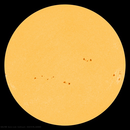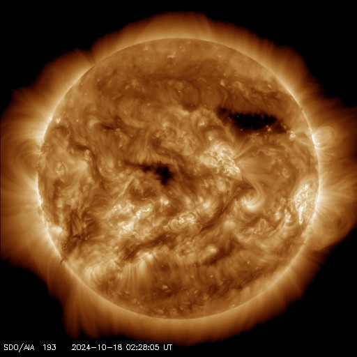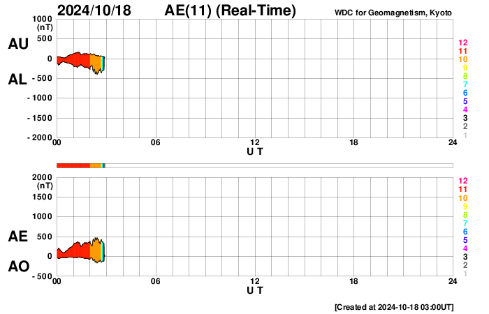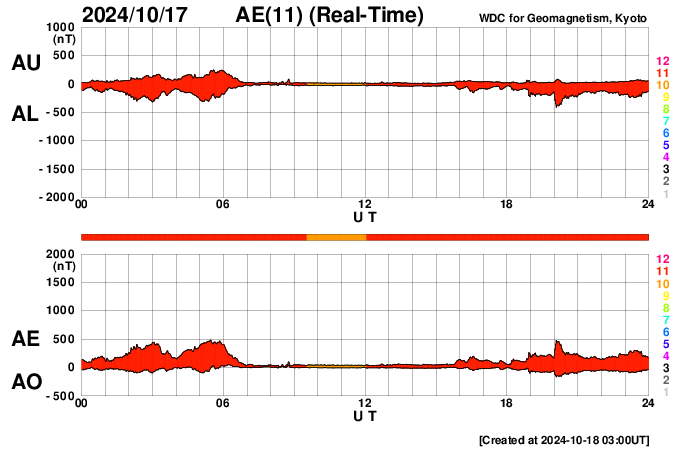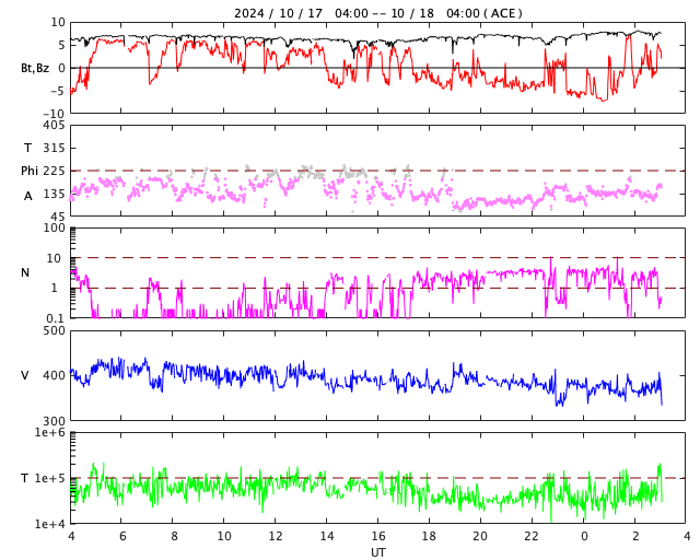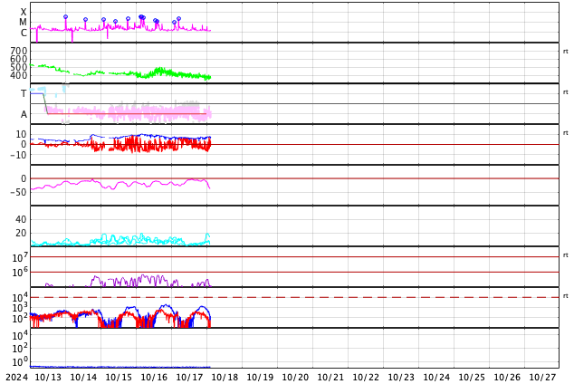 2024/10/18 12:14 更新 太陽風はやや低速です。太陽は穏やかになっています。 担当 篠原 SOHO衛星LASCO C3による紫金山・アトラス彗星は、 尾の白い層が左下に進みながら淡くなって、 ほぼ見えなくなりました。 動きが見やすくなる様に、 今日の動画はこれまでよりも早送りで作成しています。 太陽風の速度は、400km/秒から380km/秒へ少し下がっています。 磁場強度は、6〜7nTで安定しています。 SDO衛星AIA193の太陽コロナ写真の 北西側(右上)に見えているコロナホールの影響に注目していますが、 今のところ変化はありません。 この後、影響が見られるでしょうか。 太陽風磁場の南北成分は、 グラフの前半は北寄りで、後半は南寄りになっています。 磁気圏の活動もこれに対応して、 AE指数は変化のない状態がしばらく続き その後、300〜500nTの小規模の変化が発生しています。 グラフの最後では、磁場は北寄りに変わりそうにも見えますが、 どうなるでしょうか。 太陽は、17日14時(世界時17日5時)に 南西(右下)の3852黒点群でM2.4の中規模フレアが発生した後は、 Cクラスの小規模フレアの発生だけになっています。 その中では、中心部南東側(左下)の3860群で、 C6.6、C3.2、C5.4と小規模フレアが続いています。