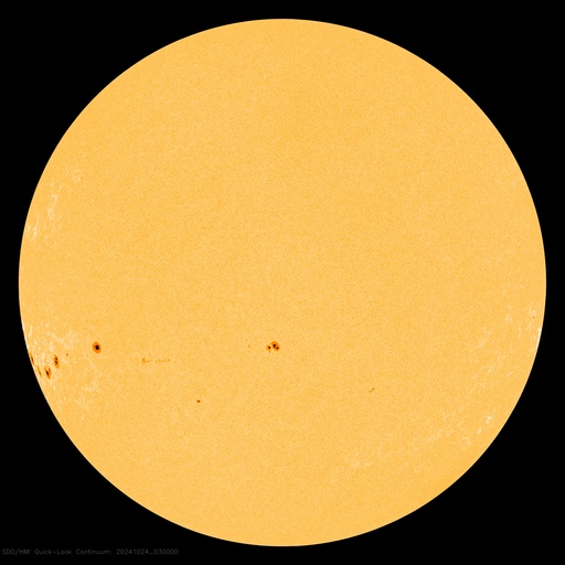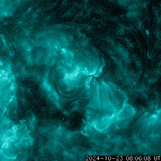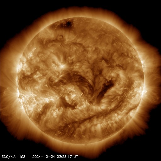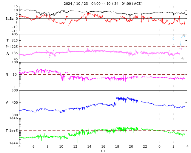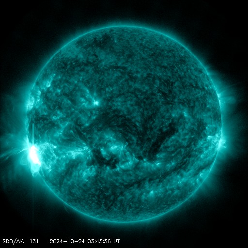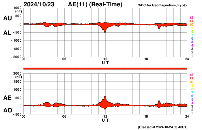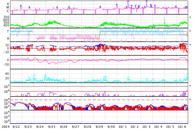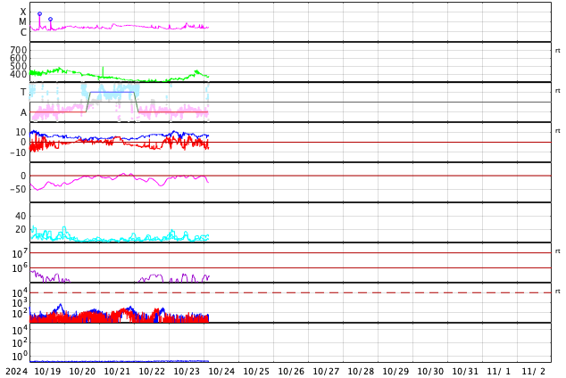 2024/10/24 12:57 更新 低速の太陽風が続いています。X3.0に達する大規模フレアが発生しました。 担当 篠原 太陽風は、速度が340km/秒から400km/秒へ少し上がり、 その後360km/秒へ下がっています。 変化は小幅で、低速の状態は続いています。 磁場強度は、10nTから6nTへ下がっています。 現在は平均的な状態です。 磁場の南北成分は、0nTを挟んで南北に変化しています。 南向きになった頃に磁気圏の活動がやや強まって、 AE指数に300〜600nTの小規模の変化が発生しています。 変化は一時的で、全体としては穏やかな状態です。 太陽は、中心部の3863黒点群で、 昨夜、23日20時半(世界時23日11時半)に C7.8の小規模フレアが発生しています。 SDO衛星AIA131、193の動画を見ると、 小規模のコロナの噴出が発生しているかもしれません。 3日後くらいに太陽風磁場の強まりが見られるかもしれません。 また、今日に入った頃から、 南東の端(左下)の3869群周辺で小さい活動が目立つようになり、 C5.1、C5.4、C5.4、C4.2と小規模フレアが発生しています。 今後の活動に注目して下さい。 と記事を書いているところで、 X3.0に達する大規模フレアが3869黒点群で発生しました。 最新の画像を掲載します。 まだ進行中なので、フレアのピークの値は分かっていません。 これから授業が始まるので、詳細は明日お知らせします。