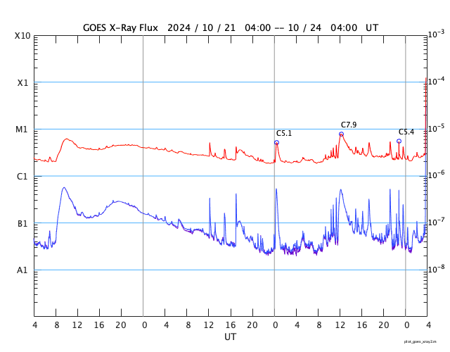 GOES衛星の太陽X線強度。赤・橙 = 0.1〜0.8 nm、青・紫 = 0.05〜0.4 nm (c) データ:NOAA/SWPC、作図:宇宙天気ニュース ![]() | ||||||||||||||||||||||||||||||||||||||||||||||||||||||||||||||||||||||||||||||||||||||||||||||||||||||||||||||||||||||||||||||||||||||||||||||||||||||||||||||||||||||||||||||||||||||||||||||||||||||||||||||||||||||||||||||||||||||||||||||||||||||||||||||||||||||