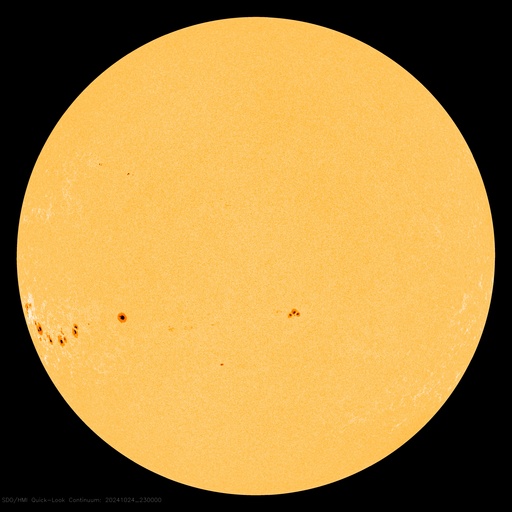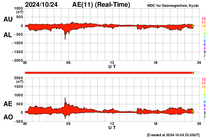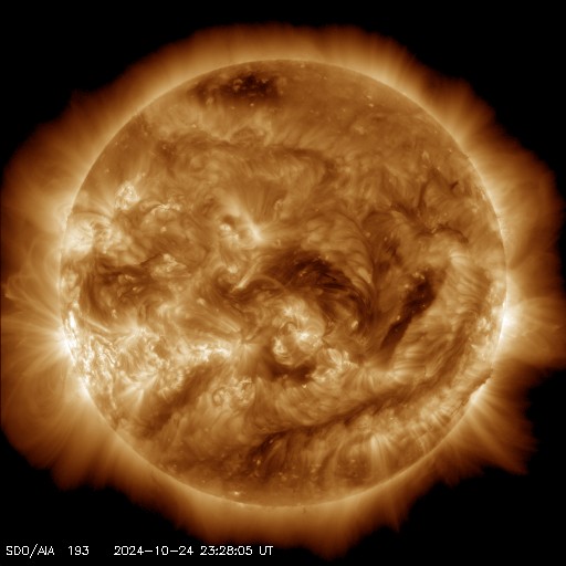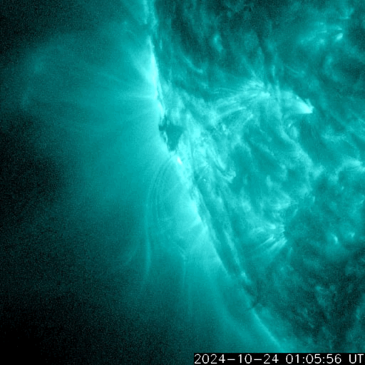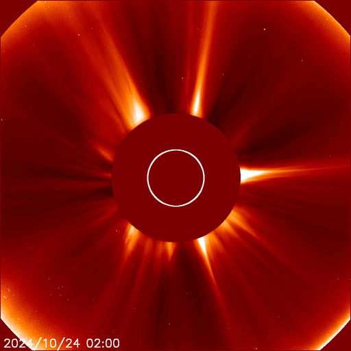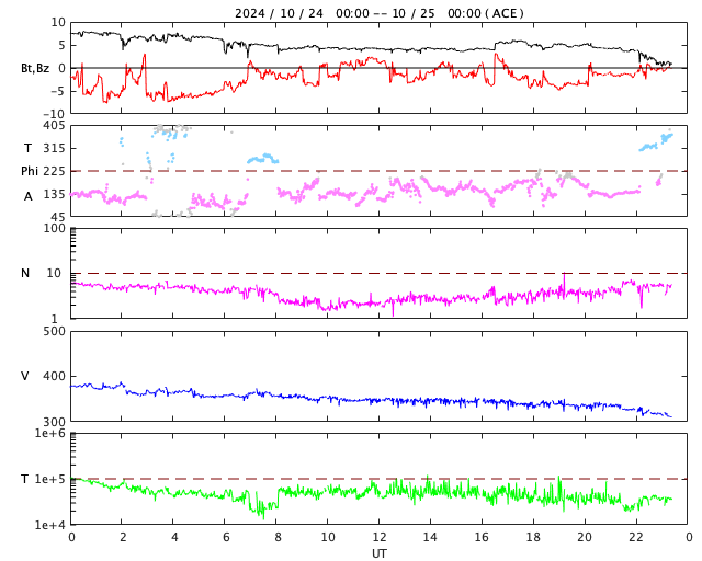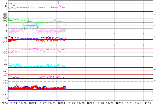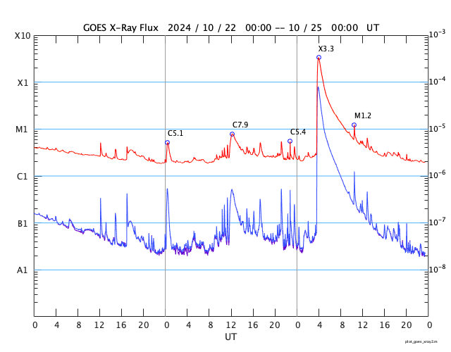 2024/10/25 08:37 更新 昨日の大規模フレアはX3.3になりました。CMEによる太陽風の乱れが到来しそうです。 担当 篠原 昨日のニュースでお知らせしていた、 24日12時半(世界時24日3時半)に発生した大規模フレアは、 X3.3の規模に達しました。 SDO衛星AIA131の動画を掲載します。 フレアが発生したのは、 太陽の南東の端近く(左下)の3869黒点群です。 Xクラスのフレアの発生は、 世界時10月9日のX1.4以来で、2週間ぶりです。 フレアに伴ってCME(コロナ質量放出)が発生しています。 SOHO衛星LASCO C2、C3の動画を見ると、 コロナのガスは太陽の左下に向かって飛び出していますが、 太陽の右上にも広がりが見えていて、 噴出の端の方が地球に向かっている様です。 到来まで2日程度かかると考えると、 やって来るのは、明日、26日くらいでしょうか。 真正面ではありませんが、 どの程度の乱れがやって来るでしょうか。 注目して下さい。 太陽では、その後は目立つ規模の活動は発生していませんが、 南東の端の領域で小さい活動が続いています。 引き続き、フレアの発生にも注目して下さい。 太陽風は、速度が380km/秒から310km/秒へ下がり、 より低速になっています。 磁場強度は5nT前後で推移していましたが、 グラフの最後で弱くなっています。 一時的な変化ではないかと思います。 磁場の南北成分は、南寄りの傾向が続いていました。 このため、磁気圏では弱い活動が続いていて、 AE指数は300nT程度の小規模の変化が頻繁に発生しています。 この後はどの様な傾向になるでしょうか。 明日以降、太陽風の強まりと磁気圏への影響に注目して下さい。 ![]() 3869黒点群で発生した、X3.3の大規模フレア。 (c) SDO衛星AIA131 (NASA)、(動画加工 : 宇宙天気ニュース) ![]() CMEは太陽を囲むように広がっていて、太陽風の乱れは地球に到来しそうです。 (c) SOHO衛星LASCO C2、C3 (ESA & NASA)、(動画加工 : 宇宙天気ニュース) ![]() SDO衛星のAIA193カメラによる太陽コロナの様子 (c) SDO (NASA) ![]() SDO衛星による太陽の可視光写真。マウスの矢印を写真に重ねると、黒点番号付きの写真に切り替わります。 (c) SDO (NASA) ![]() GOES衛星の太陽X線強度。赤・橙 = 0.1〜0.8 nm、青・紫 = 0.05〜0.4 nm (c) データ:NOAA/SWPC、作図:宇宙天気ニュース ![]() ACEが観測した太陽風の磁場(黒線は全体の強度、赤線は南北成分) 磁場の向き、プラズマの密度、速度、温度 (c) データ:NOAA/SWPC、作図:宇宙天気ニュース ![]() AE指数(速報値) 下段のAEグラフの値が高くなると、オーロラ活動が活発化しています。 (c) 京都大学WDC ![]() ![]() 27日の太陽周期に合わせた図 太陽が同じ面を地球に向けていた27日前の変化から、今後を予想することができます。 (c) 作図:宇宙天気ニュース