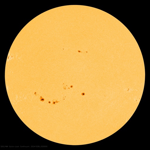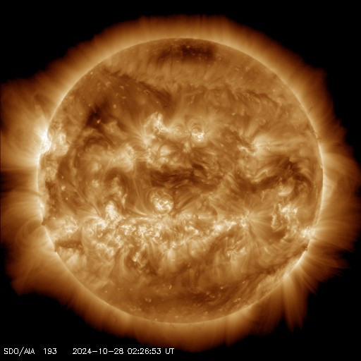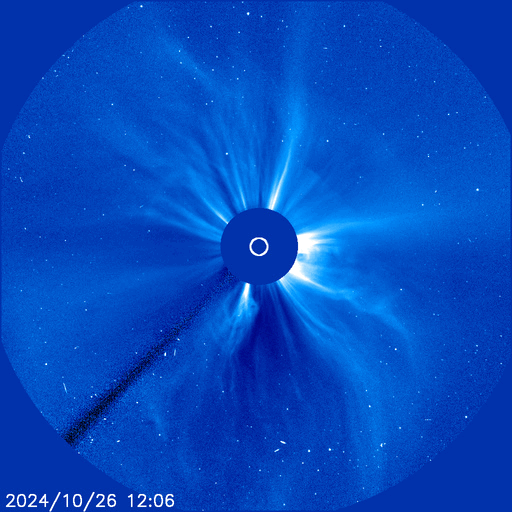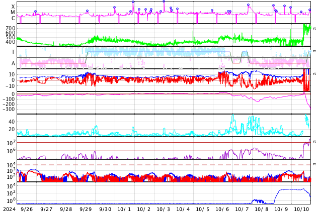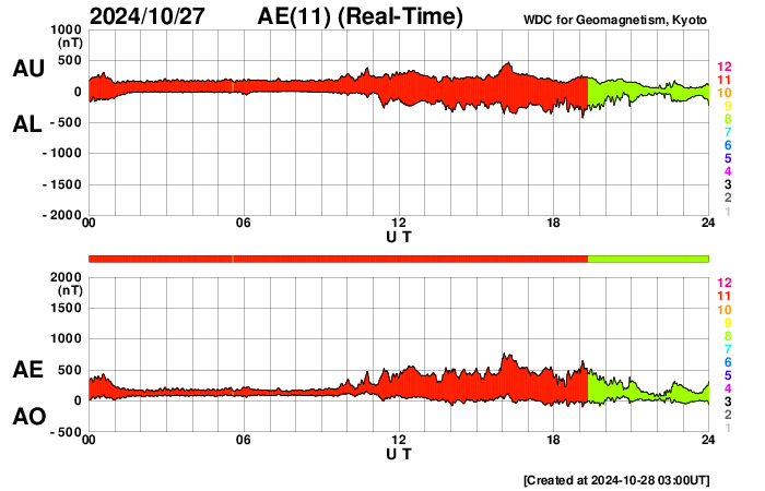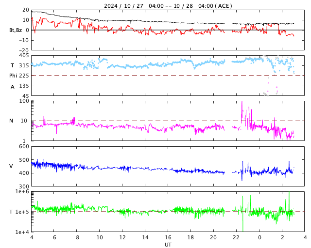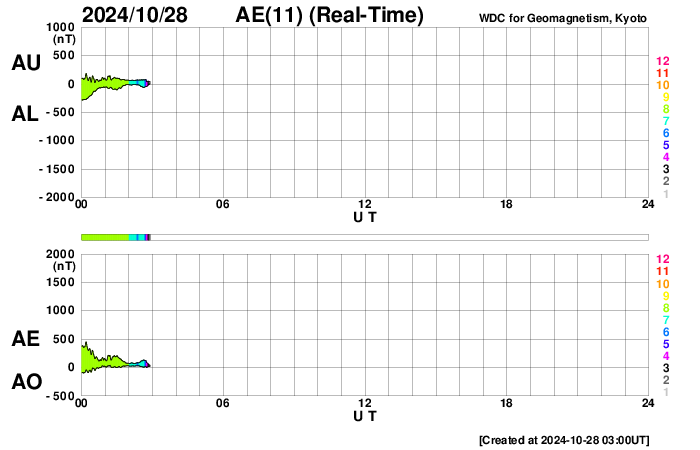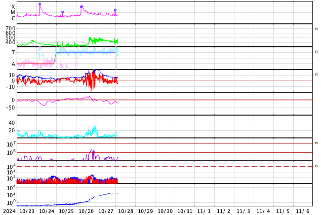 2024/10/28 12:14 更新 太陽風は平均的な状態に戻っています。次の太陽風の乱れが近付いています。 担当 篠原 SOHO衛星LASCO C3で、 太陽に接近する小型の彗星が見えています。 右下から太陽に向かう様子を動画で紹介します。 太陽風の速度は、 450km/秒から400km/秒へ少し下がっています。 平均的な状態です。 20nTに強まっていた磁場強度は、 昨日のニュース以降はゆっくりと低下して、 現在は6nTと平均的な状態に戻っています。 磁場の南北成分は、 グラフの中盤から弱い南寄りになっています。 このため、磁気圏の活動はやや高まって、 AE指数は、グラフの途中から 500nT前後の中規模の変化が続いています。 昨日のニュースで紹介したように、 26日に発生したX1.8大規模フレアによる太陽風の乱れが、 これからやって来ると考えられます。 太陽風の速度や磁場強度が高まって、 磁場が南向きに強まると、磁気圏の活動は活発になります。 今後の推移に注目して下さい。 太陽は、北東の端(左上)に現れた3878黒点群で、 C7.9やM2.8の小規模、中規模フレアが発生しています。 また、中心部南側(下側)の3869群でC9.8、 中心部北側(上側)の3874群でC7.4 などの小規模フレアも発生しています。 規模は特に大きくはありませんが、 あちこちで活動が発生しています。