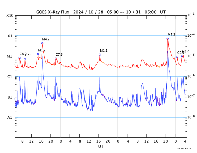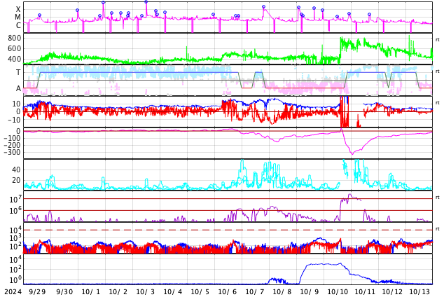 GOES衛星の太陽X線強度。赤・橙 = 0.1〜0.8 nm、青・紫 = 0.05〜0.4 nm (c) データ:NOAA/SWPC、作図:宇宙天気ニュース ![]() | ||||||||||||||||||||||||||||||||||||||||||||||||||||||||||||||||||||||||||||||||||||||||||||||||||||||||||||||||||||||||||||||||||||||||||||||||||||||||||||||||||||||||||||||||||||||||||||||||||||||||||||||||||||||||||||||||||||||||||||||||||||||||||||||||||||||||||||||||||||||