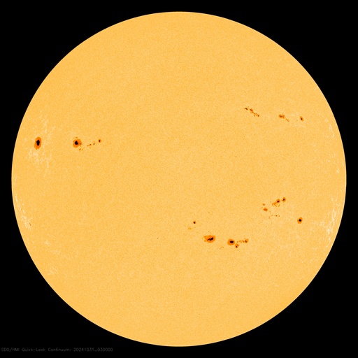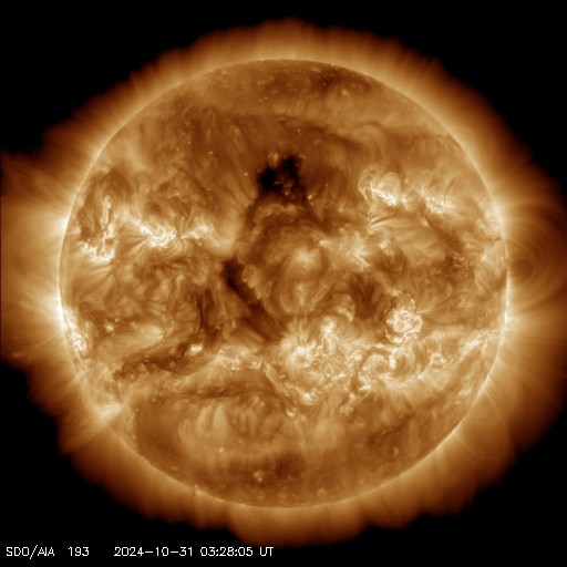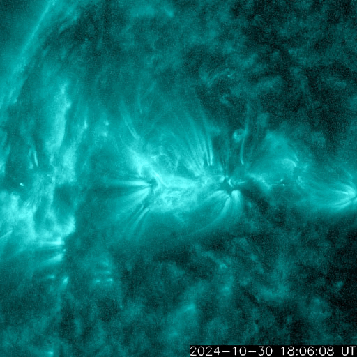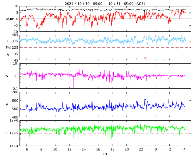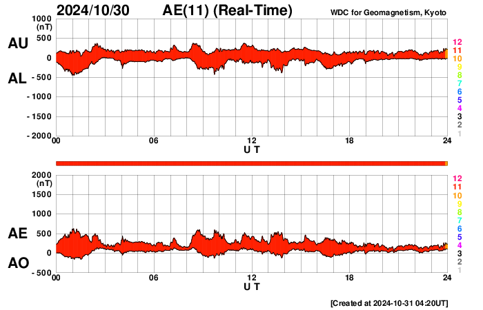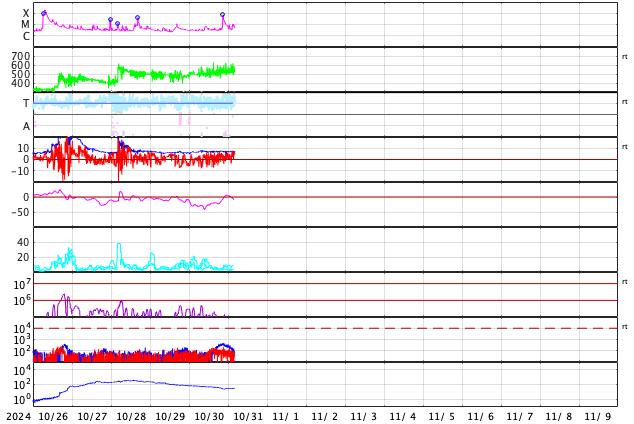 2024/10/31 13:30 更新 高速の太陽風が続いています。磁気圏は穏やかになっています。 担当 篠原 太陽風は、500km/秒から550km/秒へ速度が少し上がっていて、 高速の状態が続いています。 磁場強度は、7nTで安定しています。 磁場の南北成分は、 グラフの後半にかけて次第に北寄りになっています。 AE指数のグラフも次第に変化が少なくなって、 現在の磁気圏は穏やかです。 SDO衛星AIA193の太陽コロナ写真では、 中心部の北側に小さいコロナホールが見えています。 この影響が3日後くらいに見られるでしょうか。 太陽は、北東(左上)の3878黒点群で、 今朝早く、31日5時半(世界時30日20時半)に M7.2の中規模フレアが発生しています。 SDO衛星AIA131の動画を掲載します。 3878群はこれから太陽の中心線に近付きます。 この後も活動が続くでしょうか。 ![]() 3878黒点群で発生した、M7.2の中規模フレア。 (c) SDO衛星AIA131 (NASA)、(動画加工 : 宇宙天気ニュース) ![]() SDO衛星のAIA193カメラによる太陽コロナの様子 (c) SDO (NASA) ![]() SDO衛星による太陽の可視光写真。マウスの矢印を写真に重ねると、黒点番号付きの写真に切り替わります。 (c) SDO (NASA) ![]() ACEが観測した太陽風の磁場(黒線は全体の強度、赤線は南北成分) 磁場の向き、プラズマの密度、速度、温度 (c) データ:NOAA/SWPC、作図:宇宙天気ニュース ![]() AE指数(速報値) 下段のAEグラフの値が高くなると、オーロラ活動が活発化しています。 (c) 京都大学WDC ![]() ![]() 27日の太陽周期に合わせた図 太陽が同じ面を地球に向けていた27日前の変化から、今後を予想することができます。 (c) 作図:宇宙天気ニュース