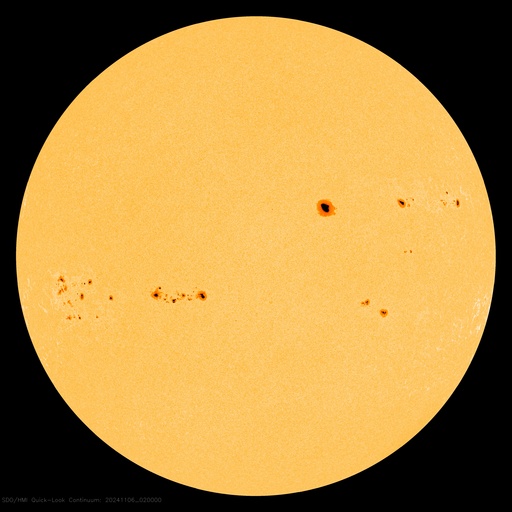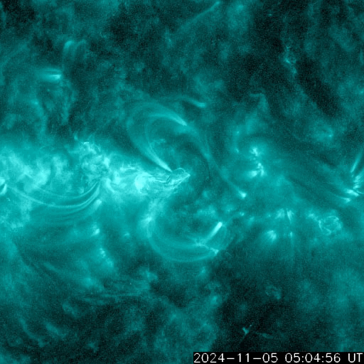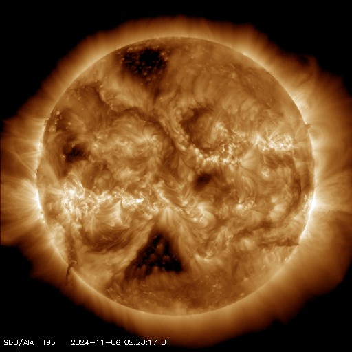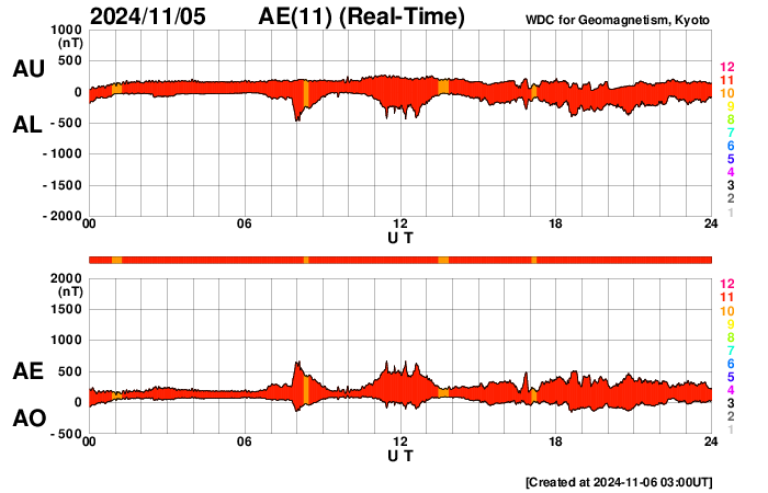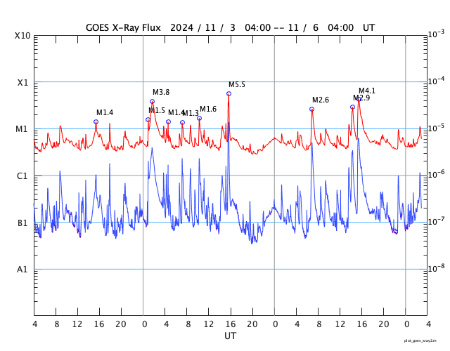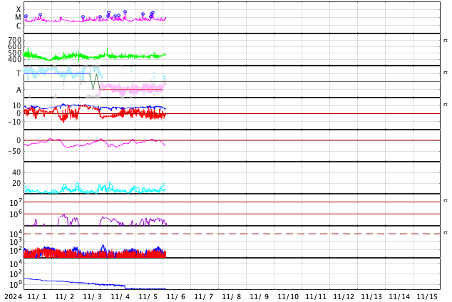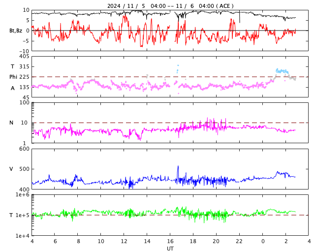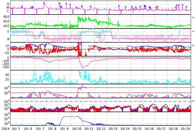 2024/11/ 6 12:04 更新 太陽風は平均的な状態です。3883群の活動がやや高まっています。 担当 篠原 太陽風の速度は、450km/秒付近で推移しています。 グラフの最後で480km/秒に少し上がる変化が見えていますが、 この後はどうなるでしょうか。 太陽風の磁場強度は、 9nTと少し強まった状態が続いていましたが、 最後で6nTに下がっています。 磁場の南北成分は、南寄りで変化が続いています。 磁気圏の活動は少し高まっていて、 AE指数は、400nTの小規模の変化が連続的に発生しています。 SDO衛星AIA193では、 南北のコロナホールが太陽の中心線に近付いています。 これらの領域の影響で、 3〜4日後くらいから太陽風の速度が高まるかもしれません。 太陽は、東の端(左端)で、 5日15時半(世界時5日6時半)にM2.6、 西の端(右端)で、 6日0時(世界時5日15時)にM4.1と、 中規模フレアがそれぞれ発生しています。 また、中心部南東側(左下)の 3883黒点群の活動度がやや高まっていて、 C8.0、M1.0、M1.2、M2.9、C9.6、C6.0、M1.1など、 中規模、小規模のフレアが頻繁に発生しています。 SDO衛星AIA131の動画を掲載します。 活動はさらに強まるでしょうか。 注目して下さい。
