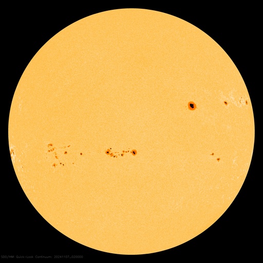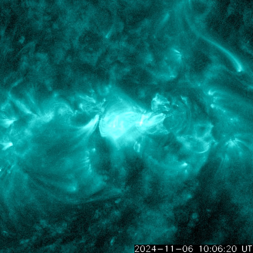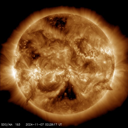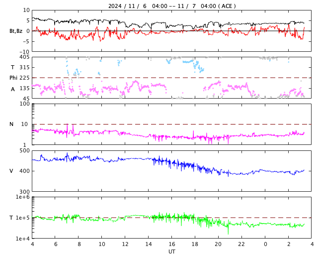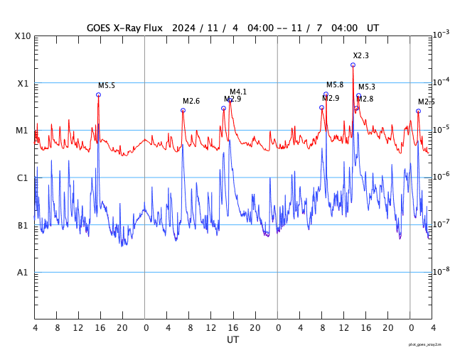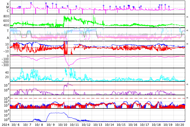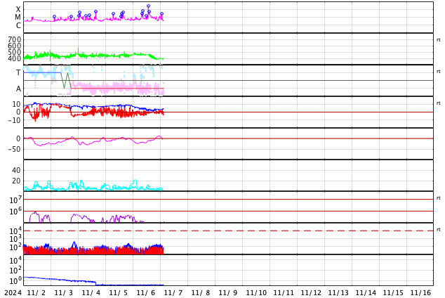 2024/11/ 7 12:33 更新 X2.3の大規模フレアが発生しました。太陽風は平均的な状態です。 担当 篠原 昨夜遅く、6日22時半(世界時6日13時半)に、 太陽の中心部南側の3883黒点群で、 X2.3の大規模フレアが発生しました。 SDO衛星AIA131の動画を掲載します。 3883群の活動の高まりは、 昨日のニュースでも紹介しましたが、 その後、M2.9、M1.5と中規模フレアが続き、 Xフレアの発生になりました。 SOHO衛星の動画を参照すると、 このフレアで、目立つ規模のCME(コロナ質量放出)は 発生していません。 また、南東の端に新しく現れた黒点群も、 M5.3、M2.5など、中規模フレアを次々に起こしています。 こちらの活動にも注目して下さい。 太陽風は、速度が450km/秒から400km/秒に少し下がっています。 平均的な状態です。 磁場強度は、4〜5nT程度で推移しています。 磁場の南北成分は、弱い南寄りから、0nT付近になり、 磁気圏の活動は、AE指数を見ると、 グラフの途中までは500nT程度の変化が続いていますが、 以降は変化が少なくなっています。 太陽風のグラフの最後で磁場は南向きに変化していますが、 この後の傾向はどの様になるでしょうか。