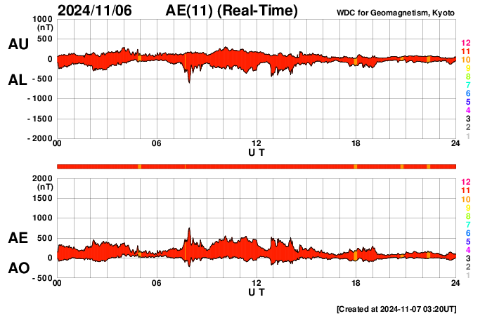 (c) SDO衛星AIA131 (NASA)、(動画加工 : 宇宙天気ニュース) ![]() SDO衛星のAIA193カメラによる太陽コロナの様子 (c) SDO (NASA) ![]() SDO衛星による太陽の可視光写真。マウスの矢印を写真に重ねると、黒点番号付きの写真に切り替わります。 (c) SDO (NASA) ![]() GOES衛星の太陽X線強度。赤・橙 = 0.1〜0.8 nm、青・紫 = 0.05〜0.4 nm (c) データ:NOAA/SWPC、作図:宇宙天気ニュース ![]() ACEが観測した太陽風の磁場(黒線は全体の強度、赤線は南北成分) 磁場の向き、プラズマの密度、速度、温度 (c) データ:NOAA/SWPC、作図:宇宙天気ニュース ![]() AE指数(速報値) 下段のAEグラフの値が高くなると、オーロラ活動が活発化しています。 (c) 京都大学WDC ![]() ![]() 27日の太陽周期に合わせた図 太陽が同じ面を地球に向けていた27日前の変化から、今後を予想することができます。 (c) 作図:宇宙天気ニュース