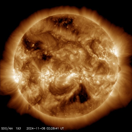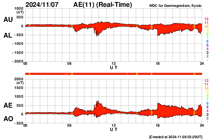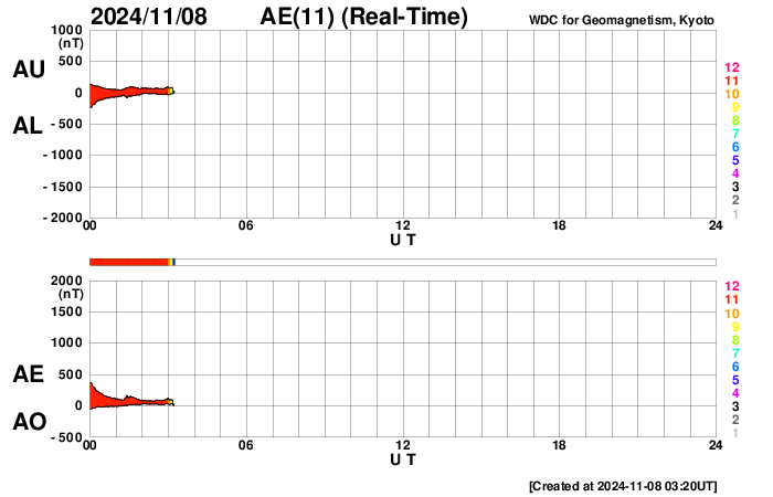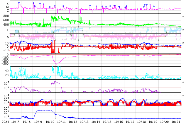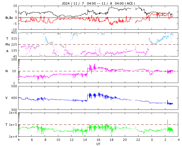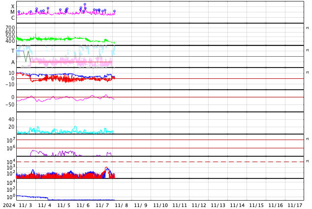 2024/11/ 8 12:28 更新 太陽風は低速になっています。Mフレアが頻繁に発生しています。 担当 篠原 太陽風は、昨夜遅く、7日23時半(世界時7日14時半)頃に、 小規模の乱れが到来して、 速度が380km/秒から420km/秒へ、小幅ですが急に高まっています。 磁場強度は、少し遅れて8nTへ少し強まる変化が発生しています。 4日のニュースでお知らせした、 M1.5、M3.8の中規模フレアの時のCME(コロナ質量放出)の乱れが、 地球にもやって来た様です。 変化は小さく、速度はすぐに下がって、 現在は350km/秒と低速になっています。 磁場強度も、3nTとやや弱くなっています。 磁場の南北成分は、 この乱れまでは南寄りで推移しています。 磁気圏の活動もある程度強まって、 AE指数は、500〜700nTの中規模の変化が発生しました。 グラフの最後で磁場は北寄りに傾向が変わり、 現在の磁気圏は穏やかになっています。 SDO衛星AIA193では、南北のコロナホールが西側に進んでいます。 これらの影響で、太陽風の速度が高まる可能性があります。 今後の変化に注目して下さい。 太陽は、中心部の3883黒点群と、 南東の端近く(左下)の3889群の活動が目立ち、 M1〜2の中規模フレアが何度も発生しています。 今後、規模が大きくなるかどうか注目して下さい。