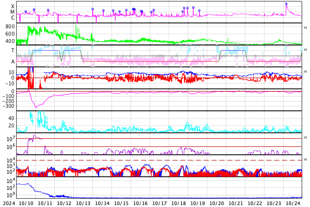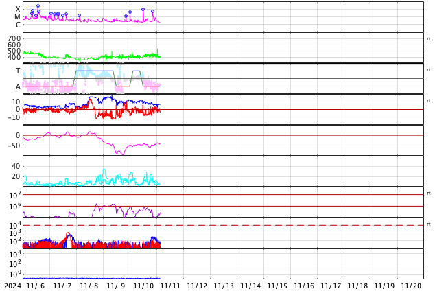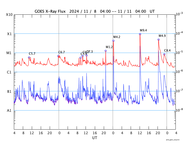 GOES衛星の太陽X線強度。赤・橙 = 0.1〜0.8 nm、青・紫 = 0.05〜0.4 nm (c) データ:NOAA/SWPC、作図:宇宙天気ニュース ![]() | |||||||||||||||||||||||||||||||||||||||||||||||||||||||||||||||||||||||||||||||||||||||||||||||||||||||||||||||||||||||||||||||||||||||||||||||||||||||||||||||||||||||||||||||||||||||||||||||||||||||||||||||||||||||||||||||||||||||||||||||||||||||||||||||||||||||||||||||||||||||