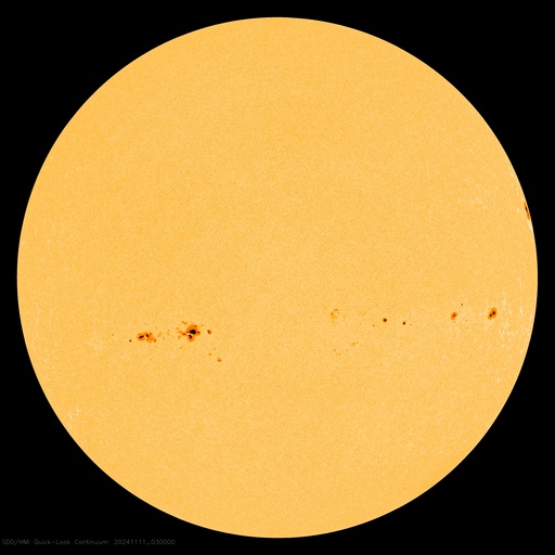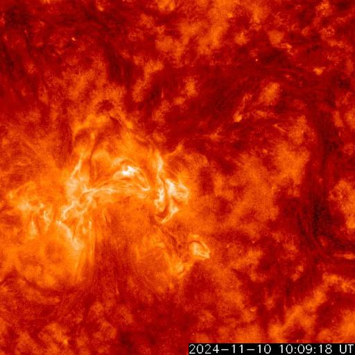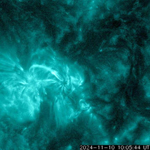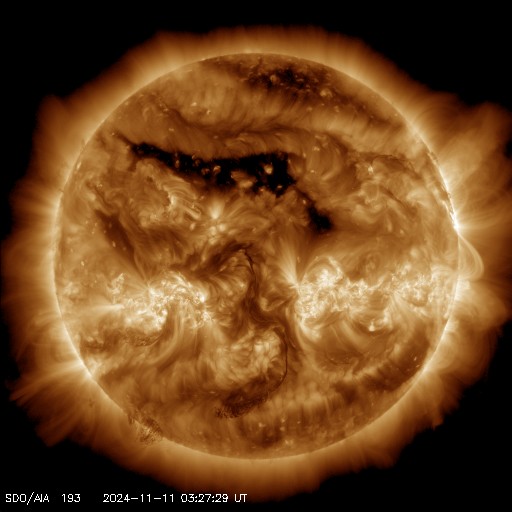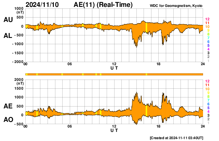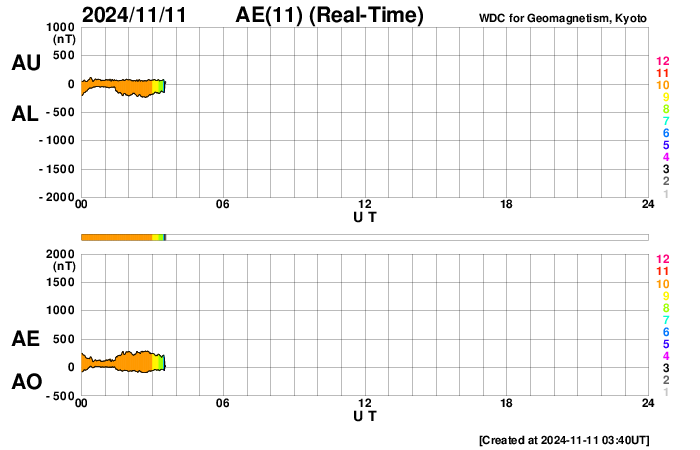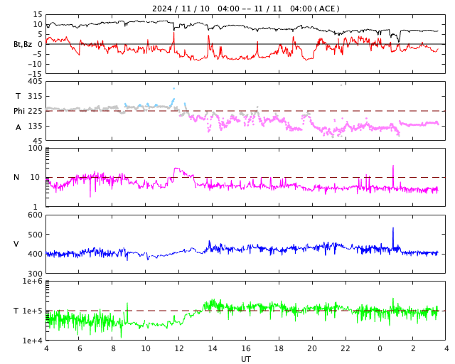 2024/11/11 12:46 更新 太陽風は平均的な速度が続いています。M9.4の中規模フレアが発生しました。 担当 篠原 太陽風は、400km/秒付近の平均的な速度が続いています。 磁場強度は、10nT程度の強まりが終わり、 グラフの後半では7nTに少し下がっています。 磁場の強まりは終わりそうです。 磁場の南北成分は、南寄りの傾向が続いています。 特にグラフの中盤では、-8nT程度と南向きに強まっています。 磁気圏の活動もこの頃に強まって、 AE指数は1200nTに達する大きい変化が2回発生しています。 現在は磁場の南向きの変化は小さくなり、 磁気圏の変化も小規模になっています。 SDO衛星AIA193では、 北半球側に東西に伸びるコロナホールが見えています。 2〜3日後くらいから太陽風が強まりそうです。 注目して下さい。 太陽は、南東(左下)の3889黒点群で、 昨夜、10日21時(世界時10日12時)にM9.4、 今朝、11日5時(世界時10日20時)にM4.9の 中規模フレアが発生しています。 M9.4フレアの動画を、SDO衛星AIA131と304で紹介します。 赤い写真のAIA304では、コロナのガスの噴出も見えています。 小規模ですが、CME(コロナ質量放出)が 太陽の左寄りに飛び出しています。 3889群はこれから太陽の中心部に達します。 引き続き活動に注目してください。