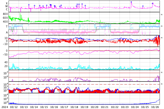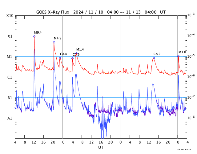 GOES衛星の太陽X線強度。赤・橙 = 0.1〜0.8 nm、青・紫 = 0.05〜0.4 nm (c) データ:NOAA/SWPC、作図:宇宙天気ニュース ![]() | ||||||||||||||||||||||||||||||||||||||||||||||||||||||||||||||||||||||||||||||||||||||||||||||||||||||||||||||||||||||||||||||||||||||||||||||||||||||||||||||||||||||||||||||||||||||||||||||||||||||||||||||||||||||||||||||||||||||||||||||||||||||||||||||||||||||