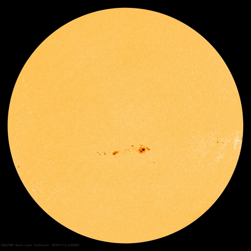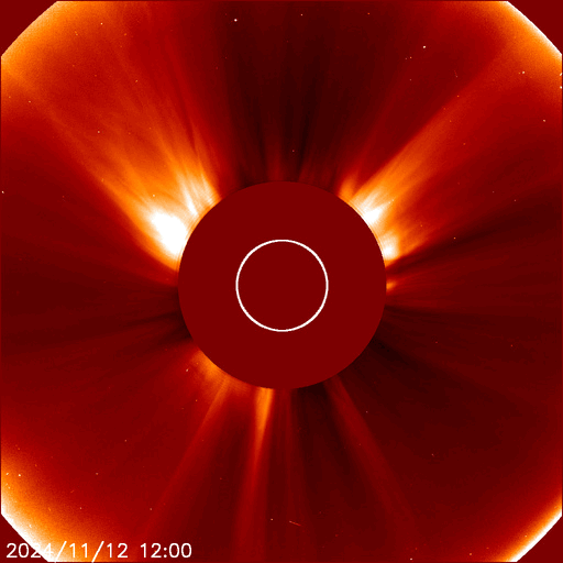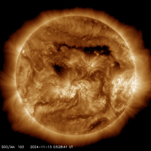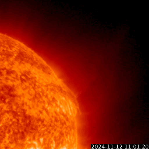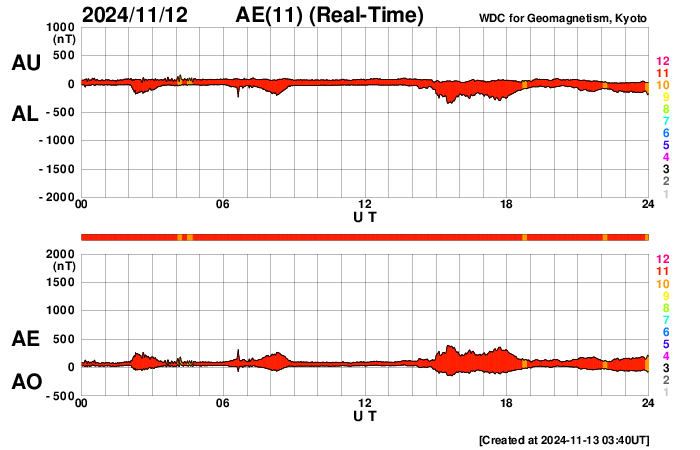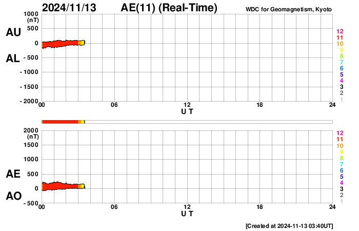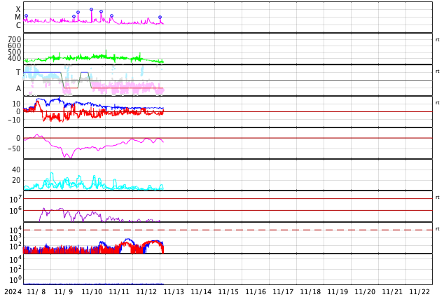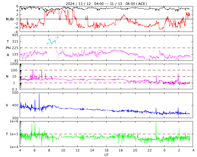 2024/11/13 12:45 更新 太陽風は低速になっています。コロナホールの影響は始まるでしょうか。 担当 篠原 太陽風の速度は、400km/秒から330km/秒へ次第に低下し、 低速の風に変わっています。 磁場強度は、5nTと平均的な状態です。 磁場の南北成分は、南寄りの傾向が続いています。 速度が下がっているため、磁気圏への影響は限定的で、 AE指数は、200〜300nTの小規模の変化が発生する程度です。 SDO衛星AIA193では、 北半球のコロナホールが西側にだいぶ進んでいます。 これから、この領域の影響で太陽風の速度が高まるかもしれません。 太陽風の変化に注目して下さい。 太陽は、中心部南側(下側)の3889黒点群で、 今朝、13日9時(世界時13日0時)に M1.0の中規模フレアが発生しています。 3889群では、この他にも小さいフレアが頻繁に発生しています。 この後も活動が続くでしょうか。 また、昨夜、12日21時(世界時12日12時)頃に、 北西の端(右上)でプロミネンス噴出が発生しています。 GOES衛星SUVI 304の動画を掲載します。 この噴出により、 CME(コロナ質量放出)が太陽の右上に広がっています。 横向きの噴出になっているので、地球への影響はありませんが、 発生が1週間ほど早ければ、 太陽風の乱れは地球に来ていたかもしれません。