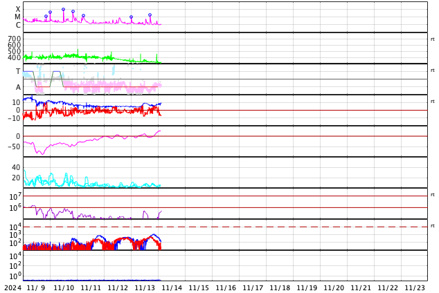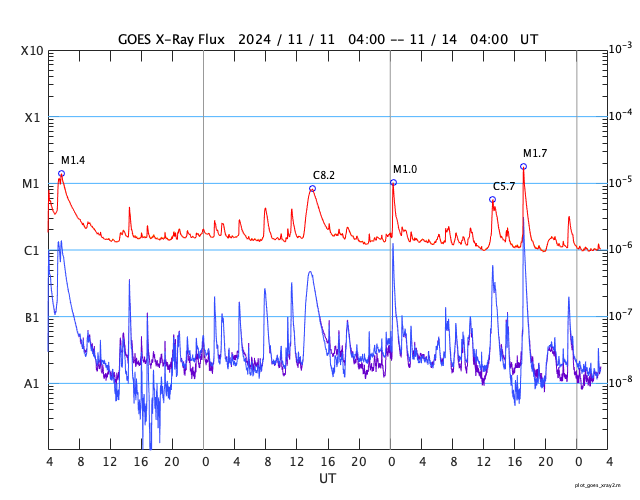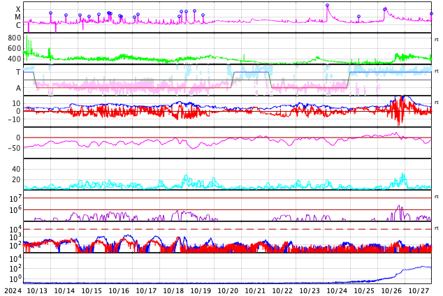 GOES衛星の太陽X線強度。赤・橙 = 0.1〜0.8 nm、青・紫 = 0.05〜0.4 nm (c) データ:NOAA/SWPC、作図:宇宙天気ニュース ![]() | ||||||||||||||||||||||||||||||||||||||||||||||||||||||||||||||||||||||||||||||||||||||||||||||||||||||||||||||||||||||||||||||||||||||||||||||||||||||||||||||||||||||||||||||||||||||||||||||||||||||||||||||||||||||||||||||||||||||||||||||||||||||||