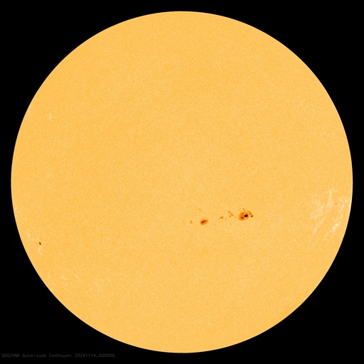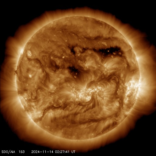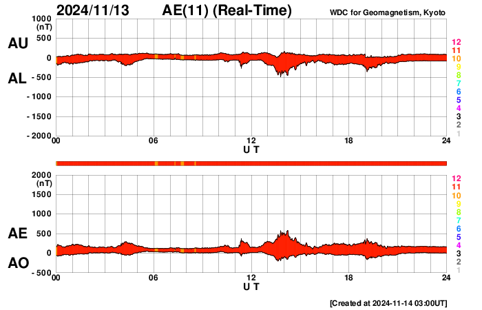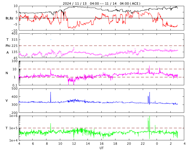 2024/11/14 12:19 更新 太陽風は低速の状態が続いています。磁気圏も概ね静穏です。 担当 篠原 太陽風は、速度が330km/秒から310km/秒へ下がり、 より低速になっています。 磁場強度は、5nTと10nTの間をゆっくりと上下しています。 SDO衛星AIA193の太陽コロナ写真では、 北半球のコロナホールは北西側(右上)に進んでいますが、 速度の高まりは発生していません。 遅れて始まるのか、このまま変化は見られないのか、 引き続き注目してください。 太陽風磁場の南北成分は、 -7nT程度の強い南向きの変化が2回発生しています。 速度が下がっているため影響は限定的で、 AE指数は、500nTの変化が発生した程度で、 現在も穏やかな状態です。 太陽は、中心部の南西側(右下)に進んだ3889黒点群で、 C5.7の小規模フレアや、 M1.7の中規模フレアが発生しています。 その他は、全体的に黒点が少なくなっていて、 太陽は穏やかな状態になっています。 ![]() SDO衛星のAIA193カメラによる太陽コロナの様子 (c) SDO (NASA) ![]() SDO衛星による太陽の可視光写真。マウスの矢印を写真に重ねると、黒点番号付きの写真に切り替わります。 (c) SDO (NASA) ![]() ACEが観測した太陽風の磁場(黒線は全体の強度、赤線は南北成分) 磁場の向き、プラズマの密度、速度、温度 (c) データ:NOAA/SWPC、作図:宇宙天気ニュース ![]() AE指数(速報値) 下段のAEグラフの値が高くなると、オーロラ活動が活発化しています。 (c) 京都大学WDC ![]() ![]() 27日の太陽周期に合わせた図 太陽が同じ面を地球に向けていた27日前の変化から、今後を予想することができます。 (c) 作図:宇宙天気ニュース