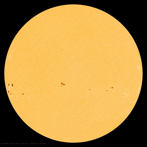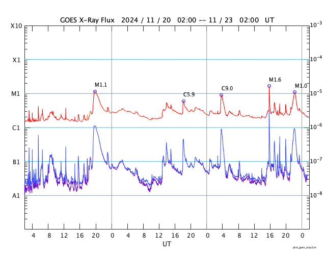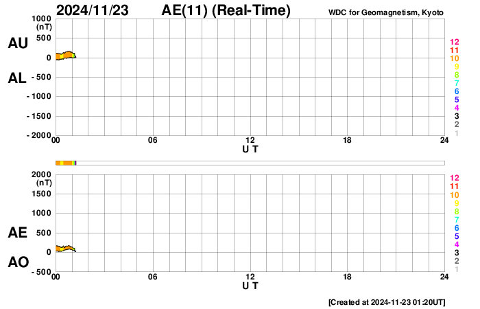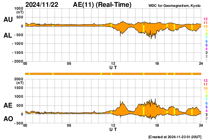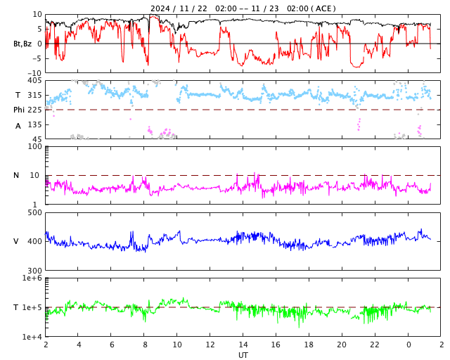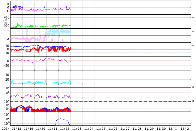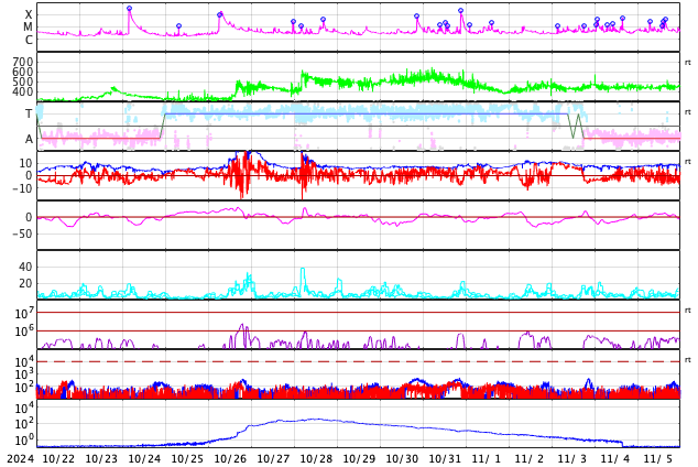 2024/11/23 10:34 更新 太陽風は平均的な状態です。磁気圏の活動がやや高まっています。 担当 篠原 太陽風の速度は、400km/秒と平均的な状態で安定しています。 磁場強度は、8nTから7nTへ少し下がり気味です。 磁場の南北成分は、グラフの中盤から、 -5nTくらいの南向きの変化が度々発生しています。 磁気圏の活動はある程度高まっていて、 AE指数は、400〜700nTくらいの中規模の変化が続いています。 この傾向は、この後も続くでしょうか。 SDO衛星AIA193では、コロナホールは特に見えていません。 太陽風は、穏やかな状態が続きそうです。 太陽は、南東の端近く(左下)の3905黒点群でM1.6、 すぐ下の3906群でM1.0の中規模フレアが発生しています。 これらの領域は、これから太陽の中心部へ進むので、 今後の発達の状態に注目して下さい。 昨日高まっていた太陽放射線(非常に高速の陽子)は、 既に減少して、元の状態に戻っています。