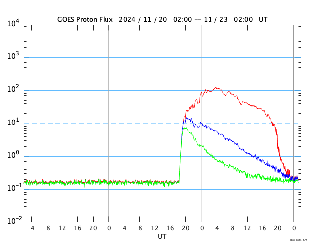 GOES衛星の太陽X線強度。赤・橙 = 0.1〜0.8 nm、青・紫 = 0.05〜0.4 nm (c) データ:NOAA/SWPC、作図:宇宙天気ニュース ![]() GOES衛星による、静止衛星軌道における高エネルギー陽子の変化 (c) データ:NOAA/SWPC、作図:宇宙天気ニュース ![]() | ||||||||||||||||||||||||||||||||||||||||||||||||||||||||||||||||||||||||||||||||||||||||||||||||||||||||||||||||||||||||||||||||||||||||||||||||||||||||||||||||||||||||||||||||||||||||||||||||||||||||||||||||||||||||||||||||||||||||||||||||||||||||||||||||||||||||||||||||