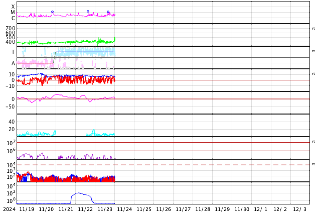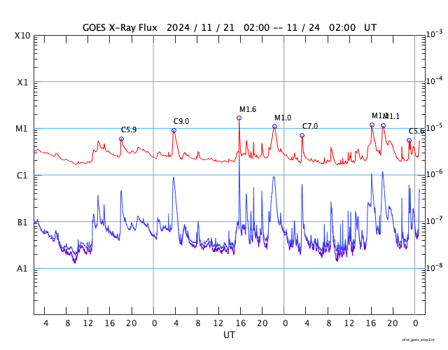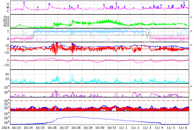GOES衛星の太陽X線強度。赤・橙 = 0.1〜0.8 nm、青・紫 = 0.05〜0.4 nm (c) データ:NOAA/SWPC、作図:宇宙天気ニュース ![]() | ||||||||||||||||||||||||||||||||||||||||||||||||||||||||||||||||||||||||||||||||||||||||||||||||||||||||||||||||||||||||||||||||||||||||||||||||||||||||||||||||||||||||||||||||||||||||||||||||||||||||||||||||||||||||||||||||||||||||||||||||||||||||||||||||||||||||||||||||||||||||||||