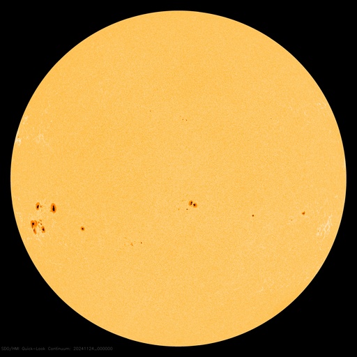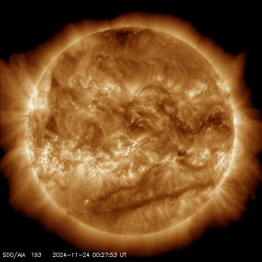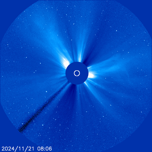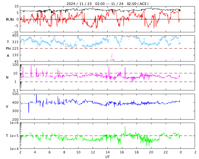 2024/11/24 10:02 更新 太陽風は平均的な速度で安定しています。小さい彗星が太陽に接近しました。 担当 篠原 宇宙天気の話題ではありませんが、 昨日、11月23日のSOHO衛星LASCO C2で、 小さい彗星が太陽に近付いて行く様子が見えていました。 LASCO C3の画像をさかのぼると、 11月21日に右下隅で見え始めて、 次第に太陽に近付いて行く様子が確認できます。 その様子を動画で掲載します。 10月の大彗星の通過は素晴らしかったですが、 このような小さい彗星の出現もSOHO衛星の楽しみです。 太陽風は、400km/秒と平均的な速さが続いています。 磁場強度は、6〜8nTと少し強めの値が続いています。 磁場の南北成分は、 0nTを挟んで、南を向いたり北を向いたりしています。 磁気圏は基本的には穏やかですが、 AE指数を見ると、時々小規模の変化が発生しています。 全く静かという状況ではありません。 SDO衛星AIA193の太陽コロナ写真は、 全体がぼんやり光っていて、 コロナホールの薄暗い領域は見えていません。 太陽風は、穏やかな状態が続きそうです。 太陽は、中心部の3901黒点群でM1.1、 北東の端の新しい領域でM1.1と 中規模フレアが2回発生しています。 その他にC3〜7程度の小規模フレアが、 3906群、3898群などで発生しています。 特に活動的という領域はなく、 現在程度の活動が続きそうな様子です。 ![]() 右下から小さい彗星が太陽に接近しました。 (c) SOHO衛星LASCO C2、C3 (ESA & NASA)、(動画加工 : 宇宙天気ニュース) ![]() SDO衛星のAIA193カメラによる太陽コロナの様子 (c) SDO (NASA) ![]() SDO衛星による太陽の可視光写真。マウスの矢印を写真に重ねると、黒点番号付きの写真に切り替わります。 (c) SDO (NASA) ![]() ACEが観測した太陽風の磁場(黒線は全体の強度、赤線は南北成分) 磁場の向き、プラズマの密度、速度、温度 (c) データ:NOAA/SWPC、作図:宇宙天気ニュース ![]() AE指数(速報値) 下段のAEグラフの値が高くなると、オーロラ活動が活発化しています。 (c) 京都大学WDC ![]() ![]() 27日の太陽周期に合わせた図 太陽が同じ面を地球に向けていた27日前の変化から、今後を予想することができます。 (c) 作図:宇宙天気ニュース