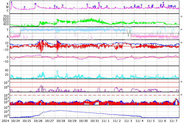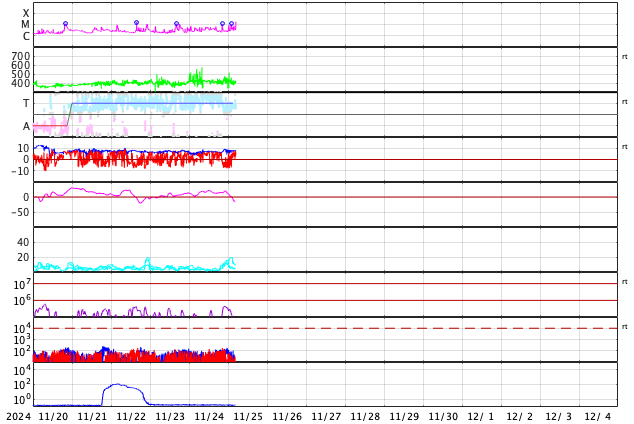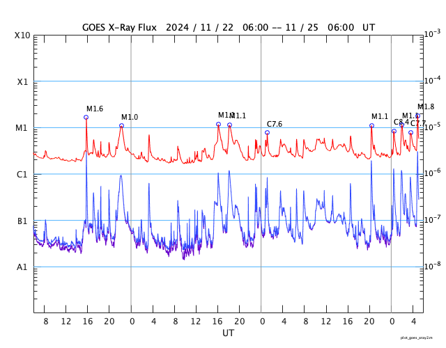 GOES衛星の太陽X線強度。赤・橙 = 0.1〜0.8 nm、青・紫 = 0.05〜0.4 nm (c) データ:NOAA/SWPC、作図:宇宙天気ニュース ![]() | ||||||||||||||||||||||||||||||||||||||||||||||||||||||||||||||||||||||||||||||||||||||||||||||||||||||||||||||||||||||||||||||||||||||||||||||||||||||||||||||||||||||||||||||||||||||||||||||||||||||||||||||||||||||||||||||||||||||||||||||||||||||||||||||||||||||||||||||||||||||||||||||||||||||||||||||||||||||||||
