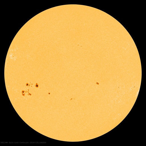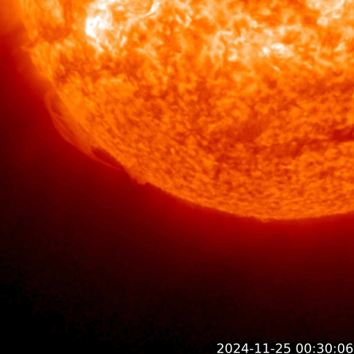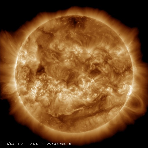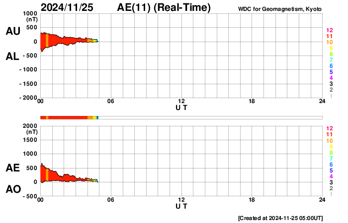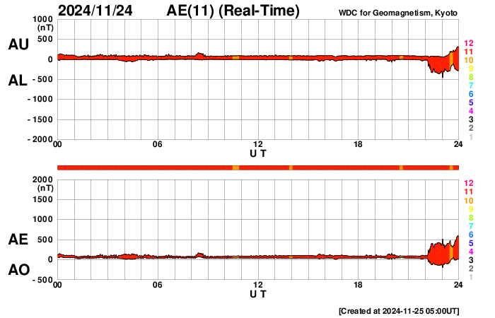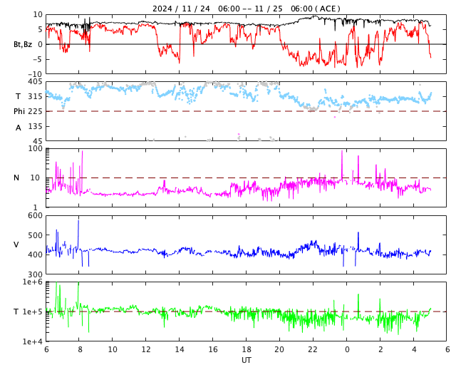 2024/11/25 14:12 更新 太陽風は平均的な速度が続いています。磁気圏も概ね静穏です。 担当 篠原 太陽風は、速度は410〜430km/秒と平均的な状態です。 磁場強度は、小幅ですが、7nTから8nTに少し上がっています。 磁場の南北成分は、グラフの後半で、 -5nTと南向きに強まる時間帯があり、 AE指数は、500nTを少し超えるくらいの中規模の変化が発生しています。 その他の時間帯では磁場は北寄りになっていて、 磁気圏は穏やかになっています。 太陽は、北東の端(左上)の領域でM1.1、 南東(左下)の3906群でM1.1とM1.8の 中規模フレアが発生しています。 また、北東の3908群でCクラスのフレアが数回発生しています。 X線グラフがややにぎやかになっていて、 規模が大きくなる様であれば注目して下さい。 25日11時(世界時25日2時)頃に、 南東のやや緯度の高い領域で、フィラメント噴出が発生しました。 GOES衛星SUVI 304の動画を掲載します。 CME(コロナ質量放出)が、 太陽の左下へ飛び出している様です。 ![]() 南東側で発生したフィラメント噴出。 (c) GOES衛星SUVI 304 (NOAA)、(動画加工 : 宇宙天気ニュース) ![]() SDO衛星のAIA193カメラによる太陽コロナの様子 (c) SDO (NASA) ![]() SDO衛星による太陽の可視光写真。マウスの矢印を写真に重ねると、黒点番号付きの写真に切り替わります。 (c) SDO (NASA) ![]() ACEが観測した太陽風の磁場(黒線は全体の強度、赤線は南北成分) 磁場の向き、プラズマの密度、速度、温度 (c) データ:NOAA/SWPC、作図:宇宙天気ニュース ![]() AE指数(速報値) 下段のAEグラフの値が高くなると、オーロラ活動が活発化しています。 (c) 京都大学WDC ![]() ![]() 27日の太陽周期に合わせた図 太陽が同じ面を地球に向けていた27日前の変化から、今後を予想することができます。 (c) 作図:宇宙天気ニュース