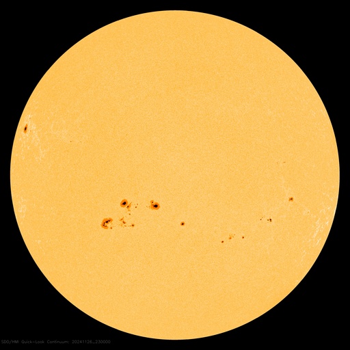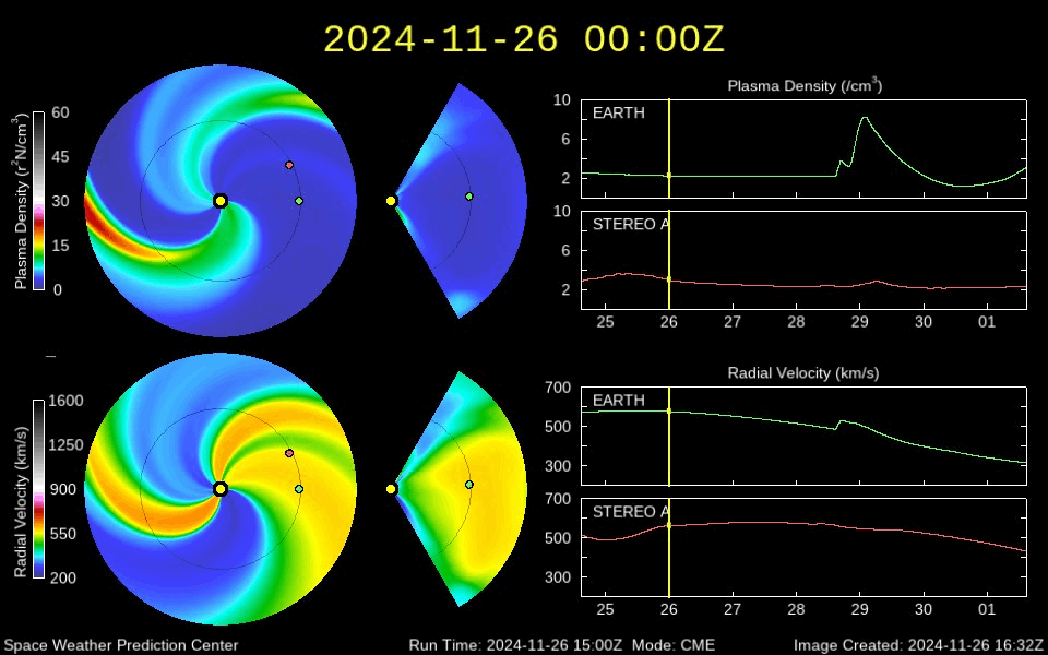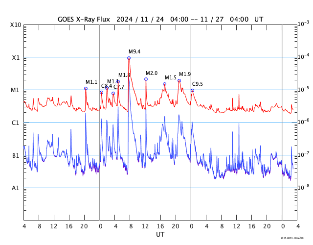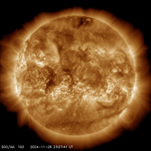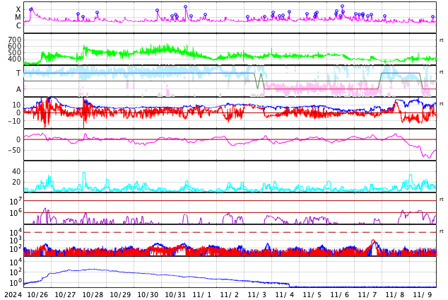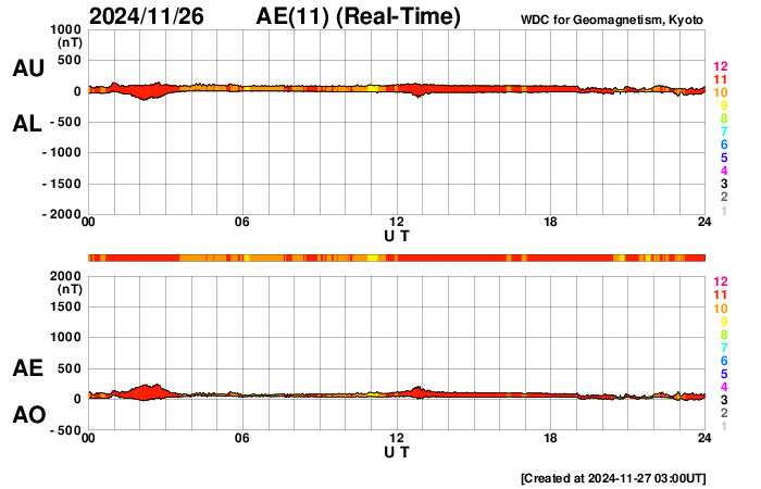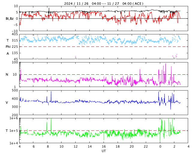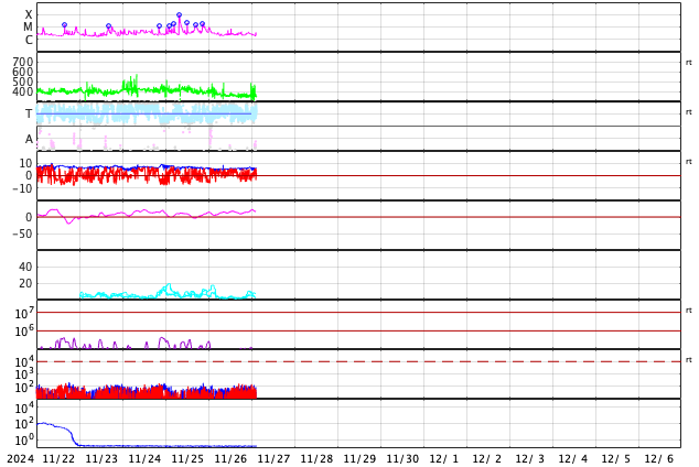 2024/11/27 12:07 更新 太陽は穏やかになっています。太陽風は低速で、磁気圏は穏やかです。 担当 篠原 昨日のニュースで紹介した、 3901黒点群のM1.9中規模フレアに伴って発生した CME(コロナ質量放出)による太陽風の乱れは、 29日2時(世界時28日17時)頃に地球に到来する可能性があると、 NOAA/SWPCの太陽風予報で発表されています。 変化としては小さいものになりそうです。 太陽自体は、その後は穏やかになっています。 中心部南東側(左下)の3906群でC5.5、 北東の端近く(左上)の3910群でC7.3の 小規模フレアが発生した程度で、 X線グラフは変化が少なくなっています。 3905群、3906群付近では、 小さい活動が頻繁に発生しています。 活動の規模の変化に注目して下さい。 太陽風は、速度が350km/秒に下がり、 低速になっています。 磁場強度は、6nTと平均的な状態です。 磁場の南北成分は、0nT付近で変化していますが、 やや北寄りになっています。 速度が下がったこともあり、磁気圏は穏やかで、 AE指数は変化が見られなくなっています。 SDO衛星AIA193では、コロナホールは特に見られず、 太陽風は穏やかな状態が続きそうです。