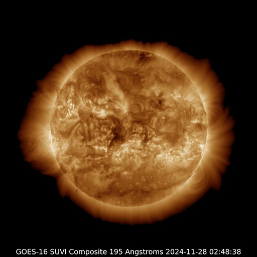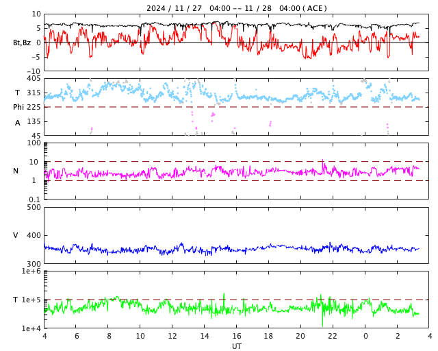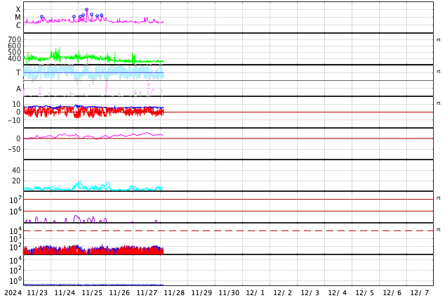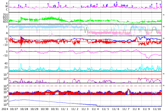2024/11/28 12:40 更新 太陽風は低速で、磁気圏は穏やかです。ニュージーランドのオーロラ動画をどうぞ。 担当 篠原 私のミスで紹介がすっかり遅れてしまったのですが、 米戸 実さんより、ニュージーランド南島クィーンズタウンで 現地11月10日1時33分(世界時9日12時33分)から 約5分間にわたって撮影された オーロラの動画をいただきました。 太陽風の速度は平均的な状態だったのですが、 この前日に磁場の強まりがやって来て、 南向きの変化が続き、磁気圏の活動が強まりました。 米戸さんによると月齢8の月が高度18度くらいにあり、 月明かりの中での撮影だったそうです。 レンズは18mmとのことです。 動きが加わるとオーロラの写真は一層引き立ちます。 現地の素晴らしい情景がより伝わってきます。 どうもありがとうございます。 現在の太陽風は、速度は350km/秒と低速の状態が続いています。 磁場強度は6nTと平均的な状態です。 磁気圏は静穏で、 AE指数は小さい変化が見られる程度です。 SDO衛星の最新画像が停止しているので、 GOES衛星のSUVI 195を掲載します。 コロナホールは特に見えておらず、 穏やかな太陽風が続きそうです。 太陽は、南西(右下)の3911黒点群でC9.5、3901群でM1.0、 中心部南側の3905群でC7.8、 北東(左上)の3910群でC6.0と、 大きくはありませんが、 あちこちの領域で小規模、中規模のフレアが起きています。 SDO衛星の更新が止まっているので、 可視光画像は掲載していません。