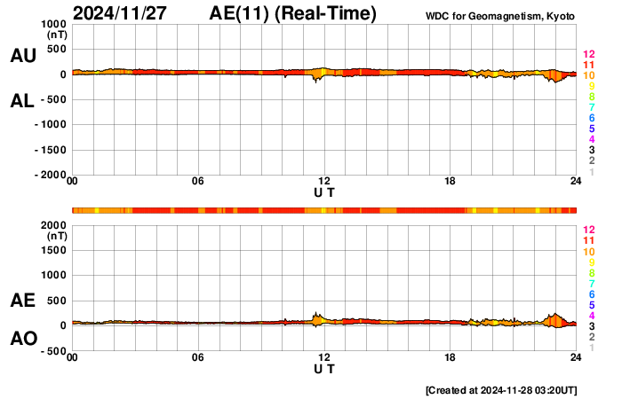 (c) 米戸 実氏 ![]() GOES衛星SUVI 195による太陽コロナの様子 (c) GOES衛星SUVI 195 (NOAA)、(動画加工 : 宇宙天気ニュース) ![]() ACEが観測した太陽風の磁場(黒線は全体の強度、赤線は南北成分) 磁場の向き、プラズマの密度、速度、温度 (c) データ:NOAA/SWPC、作図:宇宙天気ニュース ![]() AE指数(速報値) 下段のAEグラフの値が高くなると、オーロラ活動が活発化しています。 (c) 京都大学WDC ![]() ![]() 27日の太陽周期に合わせた図 太陽が同じ面を地球に向けていた27日前の変化から、今後を予想することができます。 (c) 作図:宇宙天気ニュース