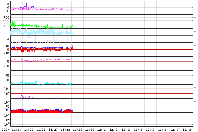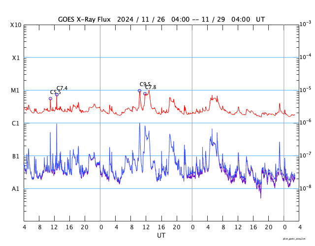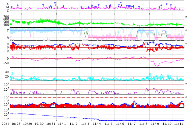 GOES衛星の太陽X線強度。赤・橙 = 0.1〜0.8 nm、青・紫 = 0.05〜0.4 nm (c) データ:NOAA/SWPC、作図:宇宙天気ニュース ![]() | ||||||||||||||||||||||||||||||||||||||||||||||||||||||||||||||||||||||||||||||||||||||||||||||||||||||||||||||||||||||||||||||||||||||||||||||||||||||||||||||||||||||||||||||||||||||||||||||||||||||||||||||||||||||||||||||||||||||||||||||||||||||||||||||||||||||||||||||||||