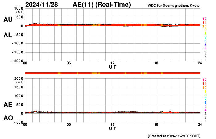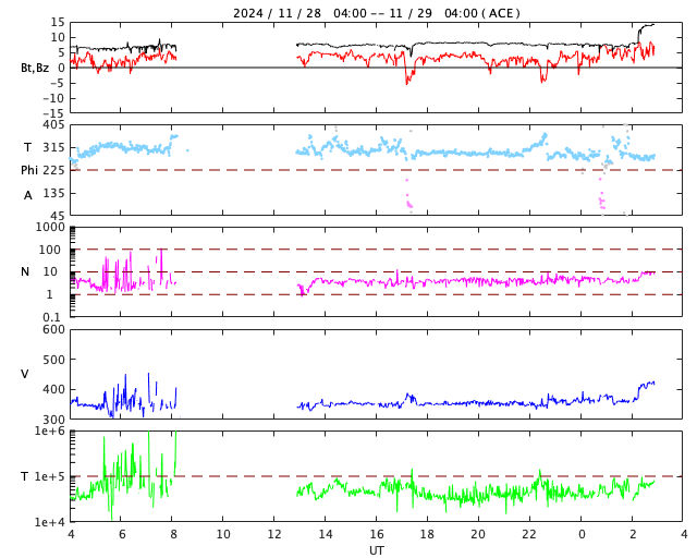 2024/11/29 12:06 更新 太陽風は低速で、磁気圏はとても穏やかです。太陽風の弱い乱れが到来しました。 担当 篠原 太陽風は、速度のグラフの一部に乱れが出ていますが、 350km/秒付近の低速の状態で安定しています。 磁場強度は、8nTと少し強まっています。 と記事を書いているところで、太陽風の急な変化が到来しました。 速度は、420km/秒と平均的な速さに少し上がった程度です。 磁場強度は14nTに強まっています。 27日のニュースでお知らせした、 CMEによる太陽風の弱い乱れが、 予報よりも半日ほど遅れて到来したのかもしれません。 今のところ、磁場は北向きに変化している様で、 この状態であれば、磁気圏への影響は小さくなりそうです。 太陽風磁場の南北成分は、 ここまでの変化は北寄りになっていました。 速度が下がっていることもあり、磁気圏はとても穏やかです。 AE指数は、ほとんど変化が見られません。 太陽コロナの写真は、GOES衛星SUVI 195を掲載しています。 コロナホールは特に見られず、 太陽風は穏やかな状態が続きそうです。 27日周期の図は、掲載しているのは15日幅ですが、 27日幅の図を見ると、27日前の11月2日から、 太陽風は400km/秒前後と高まりのない状態が続いています。 その間、磁場の強まりにより磁気圏活動の高まりは発生しました。 これからの27日間はどの様に推移するでしょうか。 太陽は、可視光写真の掲載がありませんが、 中心部南側(下側)の3905黒点群でC7.0、 南東の端(左下)の3912群でC6.7の 小規模フレアが発生した程度で、 穏やかな状態になっています。 SDO衛星はデータセンターのトラブルとのことで、 施設の復旧待ちだそうです。 衛星の問題ではなかったので、この点では一安心です。 ![]() GOES衛星SUVI 195による太陽コロナの様子 (c) GOES衛星SUVI 195 (NOAA)、(動画加工 : 宇宙天気ニュース) ![]() ACEが観測した太陽風の磁場(黒線は全体の強度、赤線は南北成分) 磁場の向き、プラズマの密度、速度、温度 (c) データ:NOAA/SWPC、作図:宇宙天気ニュース ![]() AE指数(速報値) 下段のAEグラフの値が高くなると、オーロラ活動が活発化しています。 (c) 京都大学WDC ![]() ![]() 27日の太陽周期に合わせた図 太陽が同じ面を地球に向けていた27日前の変化から、今後を予想することができます。 (c) 作図:宇宙天気ニュース