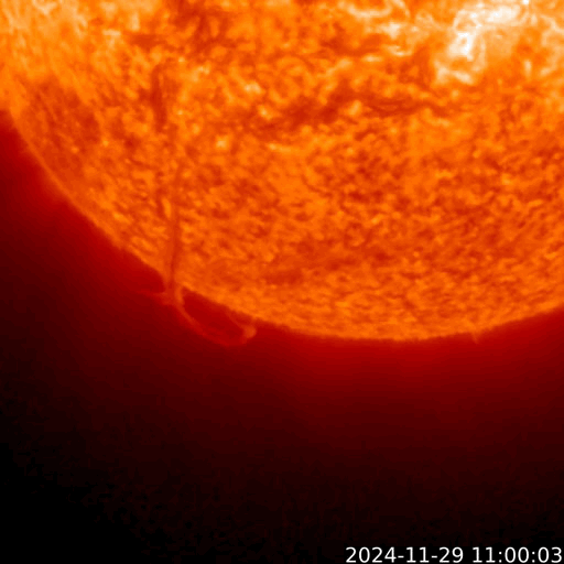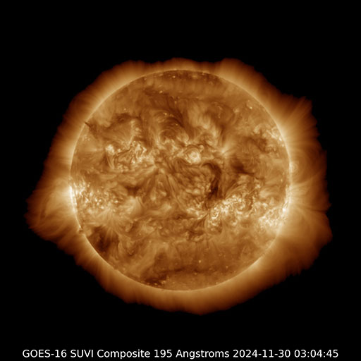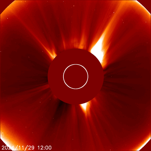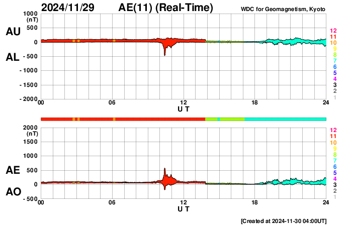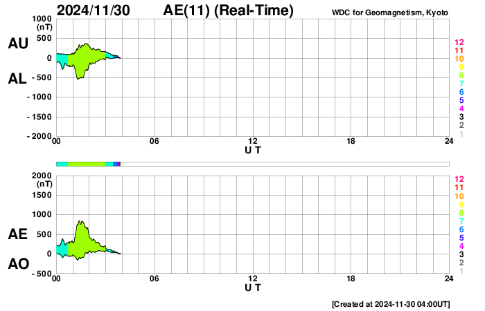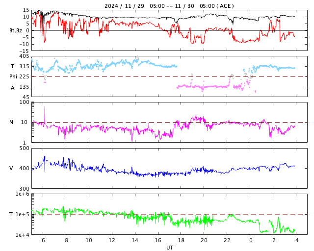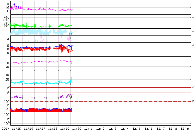 2024/11/30 13:10 更新 太陽風は平均的な速度です。磁場が南向きになって磁気圏の活動がやや高まりました。 担当 篠原 太陽風の速度は、410km/秒から370km/秒へ少し下がり、 再び410km/秒と平均的な速度に戻っています。 磁場強度は、強まりが残っていて、 10nT前後で推移しています。 磁場の南北成分は、 グラフの後半で南向きに強まる変化が到来しています。 このため、AE指数は、 グラフの最後に800nTの中規模の変化が発生しています。 それまでは磁気圏は静穏で、AE指数は変化も少ない状態でした。 GOES衛星SUVI 195の太陽コロナ写真では、 南東の端(左下)にコロナホールの薄暗い領域が見えています。 ここは前周期にもコロナホールが見えていた場所です。 現在はどの様な広がりになっているでしょうか。 太陽は、中心部南西側(右下)の3905黒点群、3906群、 北東(左上)の3910群、南東の端近く(左下)の3912群で C3〜5程度の小規模フレアが発生しています。 X線グラフは少し変化が目立つ様になっています。 また、昨夜、29日21時(世界時29日12時)頃に、 南の端近くでフィラメント噴出が発生しました。 GOES衛星SUVI 304の動画を掲載します。 これにより、SOHO衛星LASCO C2、C3では, 太陽の下側に広がるCME(コロナ質量放出)が観測されています。 動画では、太陽の上側にも別のCMEが飛び出しています。 向こう側で発生した現象の様です。 どちらの噴出も地球への影響はないでしょう。 ![]() 太陽の南端で発生したフィラメント噴出。 (c) GOES衛星SUVI 304 (NOAA)、(動画加工 : 宇宙天気ニュース) ![]() 太陽の上下それぞれにCMEが飛び出しています。 (c) SOHO衛星LASCO C2、C3 (ESA & NASA)、(動画加工 : 宇宙天気ニュース) ![]() GOES衛星SUVI 195による太陽コロナの様子 (c) GOES衛星SUVI 195 (NOAA)、(動画加工 : 宇宙天気ニュース) ![]() ACEが観測した太陽風の磁場(黒線は全体の強度、赤線は南北成分) 磁場の向き、プラズマの密度、速度、温度 (c) データ:NOAA/SWPC、作図:宇宙天気ニュース ![]() AE指数(速報値) 下段のAEグラフの値が高くなると、オーロラ活動が活発化しています。 (c) 京都大学WDC ![]() ![]() 27日の太陽周期に合わせた図 太陽が同じ面を地球に向けていた27日前の変化から、今後を予想することができます。 (c) 作図:宇宙天気ニュース