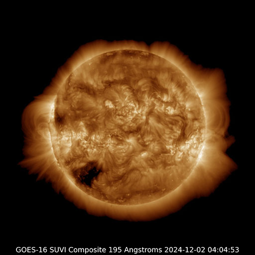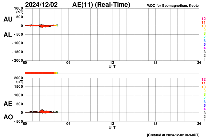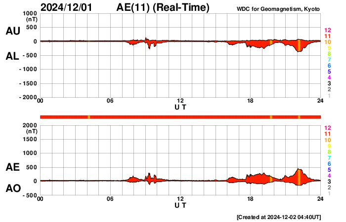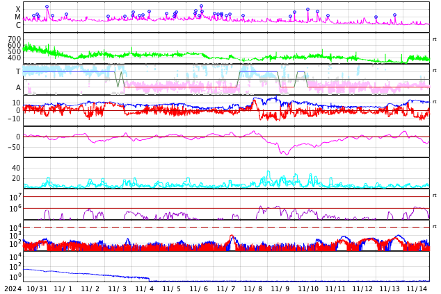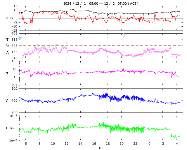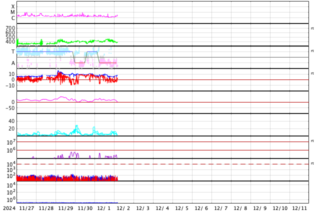 2024/12/ 2 13:48 更新 太陽風は概ね平均的な状態です。太陽は穏やかに推移しています。 担当 篠原 太陽風の速度は、400km/秒から450km/秒に少し高まり、 その後下がって、現在は 380km/秒とやや低速になっています。 磁場強度は、6〜8nTの間で推移しています。 磁場の南北成分は、 -5nT程度の南向きの変化が度々発生するようになっています。 磁気圏では小規模の活動が発生していて、 AE指数は、200〜500nT程度の変化が起きています。 太陽風の速度は下がり気味なので、 磁気圏の活動はこの程度に留まりそうです。 GOES衛星SUVI 195の太陽コロナ写真では、 南東側(左下)にコロナホールが大きく見えています。 5日後くらいから太陽風の速度が高まるかもしれません。 太陽は穏やかな状態です。 X線グラフの目立つ変化は、 南西(右下)に進んでいる3906黒点群で発生した C5.5の小規模フレアくらいです。