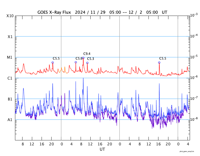 GOES衛星の太陽X線強度。赤・橙 = 0.1〜0.8 nm、青・紫 = 0.05〜0.4 nm (c) データ:NOAA/SWPC、作図:宇宙天気ニュース ![]() | ||||||||||||||||||||||||||||||||||||||||||||||||||||||||||||||||||||||||||||||||||||||||||||||||||||||||||||||||||||||||||||||||||||||||||||||||||||||||||||||||||||||||||||||||||||||||||||||||||||||||||||||||||||||||||||||||||||||||||||||||||||||||||||||||||||||||||||||||
