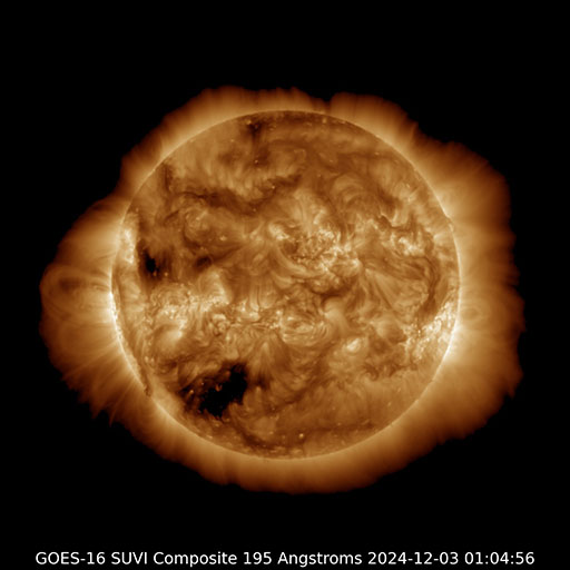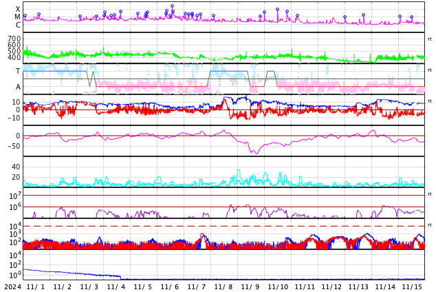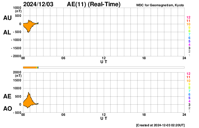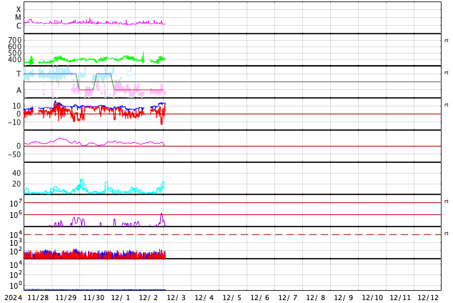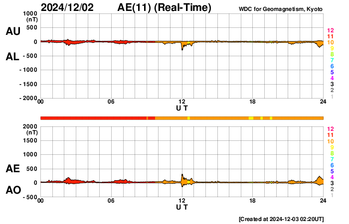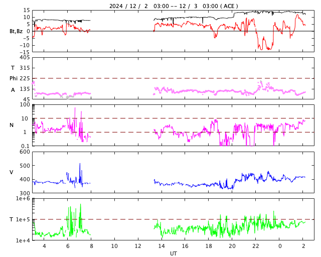 2024/12/ 3 11:23 更新 太陽風の小さい強まりが到来しました。磁気圏の活動も少し強まりました。 担当 篠原 今朝、3日5時(世界時2日20時)頃に、 太陽風の小さい強まりがACE衛星で観測されました。 速度は350km/秒から400km/秒へ少し上がって、 平均的な速さになり、 磁場強度は、9nTから14nTへ強まりました。 その2時間後くらいから磁場が南向きに大きく変化して、 南北成分は -13nTに達しました。 しかし、1時間程度で北向きに切り替わったため 磁気圏への影響は限定的で、 AE指数は、一時的に700nTの中規模の変化が発生した程度です。 現在も磁場強度は強まった状態なので、 再び南向きに切り替わると、 磁気圏の活動もある程度強まりそうです。 今朝までの太陽風は、磁場は北寄りで、 AE指数は時々小さい変化が発生する程度でした。 GOES衛星SUVI 195では、 南東(左下)のコロナホールが太陽の中心線に近付いています。 4日後くらいからこの領域の影響で太陽風が強まるかもしれません。 太陽は、C3〜4の小規模フレアが、 6回ほど発生しています。 南東の端(左下)で発生しているフレアもあり、 この後、活動的な領域が現れるかもしれません。
