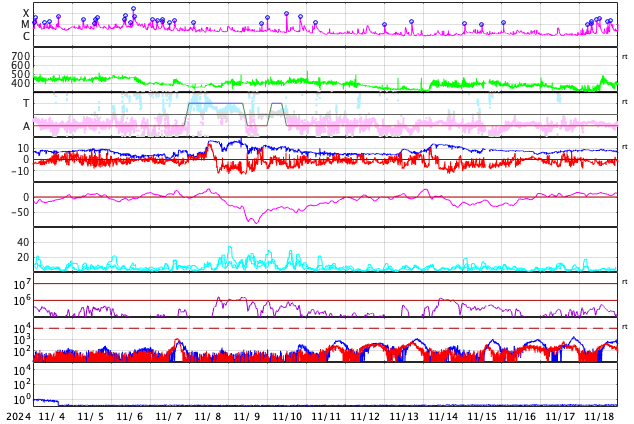 GOES衛星の太陽X線強度。赤・橙 = 0.1〜0.8 nm、青・紫 = 0.05〜0.4 nm (c) データ:NOAA/SWPC、作図:宇宙天気ニュース ![]() | |||||||||||||||||||||||||||||||||||||||||||||||||||||||||||||||||||||||||||||||||||||||||||||||||||||||||||||||||||||||||||||||||||||||||||||||||||||||||||||||||||||||||||||||||||||||||||||||||||||||||||||||||||||||||||||||||||||||||||||||||||||||||||||||||||||||||||||||||||||||||||||||||||||||||||||