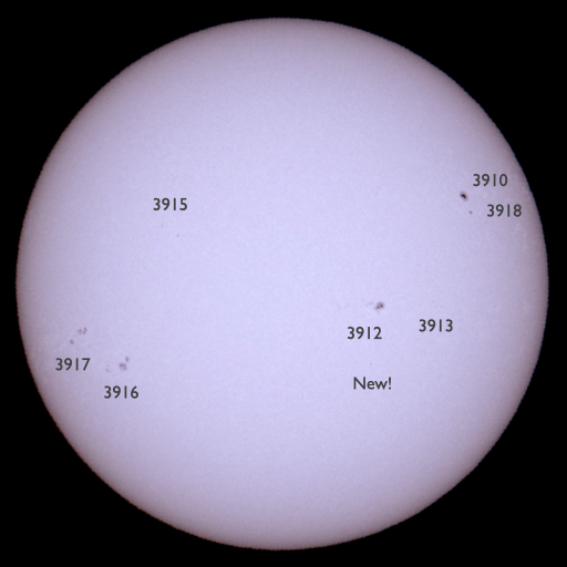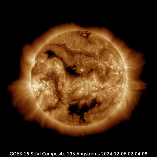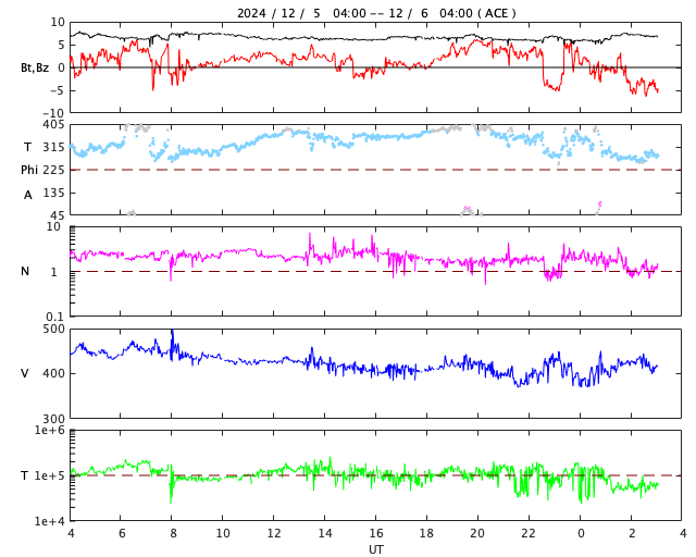 2024/12/ 6 12:15 更新 太陽風は平均的な状態で、磁気圏は穏やかです。 担当 篠原 太陽風は、速度が450km/秒から400km/秒へ少し下がっています。 平均的な状態です。 磁場強度は、6〜7nTで安定しています。 磁場の南北成分は、グラフの中盤までは、 0nT付近から北寄りで推移しています。 磁気圏は穏やかで、AE指数はほとんど変化がありません。 ただし、太陽風のグラフの後半で、 磁場が南向きに変化するようになっています。 この後、傾向が変わるのでしょうか。 GOES衛星SUVI 195の太陽コロナ写真では、 南半球のコロナホールは南西側(右下)に進み、 明日くらいから太陽風速度の高まりがやって来るかもしれません。 また、中心付近の北半球側に別のコロナホールが見えています。 こちらの影響も、3日後くらいに到来する可能性があります。 これからしばらく、太陽風の推移に注目して下さい。 今朝、太陽の可視光写真を自分で撮影しました。 拙い画像ですが、現在の太陽面を知る参考として掲載します。 X線グラフでは、Mクラスの中規模フレアが3回発生しています。 最初のM1.0は、南東(左下)の3917黒点群で発生しました。 この領域では、C3.6、C4.7などの小規模フレアも発生していて、 ある程度活動的な状態です。 続く、M1.1、M2.5の中規模フレアは、 南西の端に沈んだ3906群で発生しています。 その後もCクラスのフレアが数回発生していますが、 この後は見えなくなるでしょう。