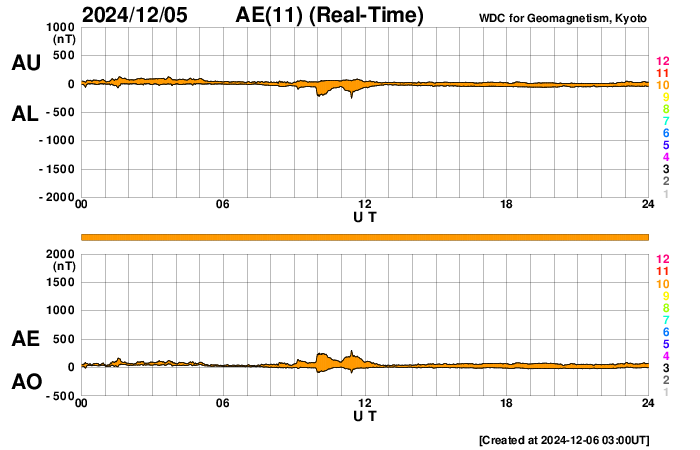 (c) GOES衛星SUVI 195 (NOAA)、(動画加工 : 宇宙天気ニュース) ![]() 6日9時半(世界時6日0時半)に鹿児島で撮影した太陽。 (c) 宇宙天気ニュース ![]() ACEが観測した太陽風の磁場(黒線は全体の強度、赤線は南北成分) 磁場の向き、プラズマの密度、速度、温度 (c) データ:NOAA/SWPC、作図:宇宙天気ニュース ![]() AE指数(速報値) 下段のAEグラフの値が高くなると、オーロラ活動が活発化しています。 (c) 京都大学WDC ![]() ![]() 27日の太陽周期に合わせた図 太陽が同じ面を地球に向けていた27日前の変化から、今後を予想することができます。 (c) 作図:宇宙天気ニュース