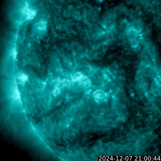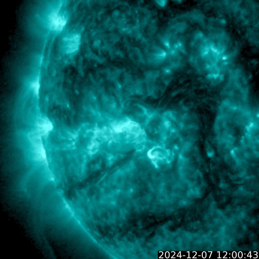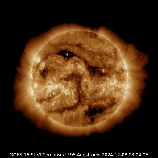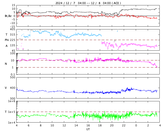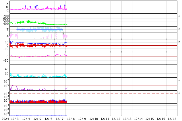 2024/12/ 8 12:50 更新 太陽風は低速の状態が続いています。M2.3、M3.2と中規模フレアが発生しています。 担当 篠原 太陽風の速度は、380km/秒から350km/秒へ下がり、 再び380km/秒に上がる小幅の変化をしています。 低速の状態は続いています。 磁場強度は、5nT前後と平均的な状態でしたが、 今朝以降、10nTへ強まっています。 同じ頃に、太陽風磁場の大まかな方向が 「T」から「A」へ切り替わっていて、 この変化に関係している様です。 磁場の南北成分は、0nT付近で変化していて、 磁気圏は概ね静穏でした、 太陽風のグラフの最後で、磁場がやや南寄りになっています。 この傾向が続くと、磁気圏の活動が少し高まるかもしれません。 GOES衛星SUVI 195のコロナ写真では、 北半球のコロナホールが西側に次第に進んでいます。 南半球のコロナホールの影響は特にありませんでしたが、 こちらはどうでしょうか。 この後の太陽風の変化に注目して下さい。 太陽は、中心部南東(左下)の3917黒点群で、 昨夜、7日22時(世界時7日17時)にM2.3、 今朝、8日7時(世界時7日22時)にM3.2と、 中規模フレアが2回発生しています。 それぞれ、GOES衛星SUVI 131の動画を掲載します。 3917群はCクラスのフレアも起こしていて、 少し活動度が上がっている様です。