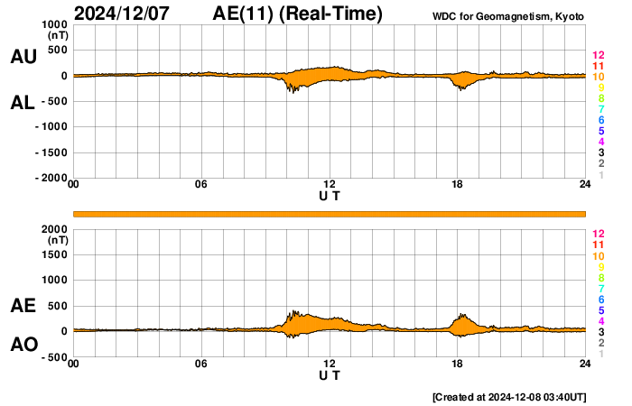 (c) GOES衛星SUVI 131 (NOAA)、(動画加工 : 宇宙天気ニュース) ![]() 3917黒点群で発生した、M3.2の中規模フレア。 (c) GOES衛星SUVI 131 (NOAA)、(動画加工 : 宇宙天気ニュース) ![]() GOES衛星SUVI 195による太陽コロナの様子 (c) GOES衛星SUVI 195 (NOAA)、(動画加工 : 宇宙天気ニュース) ![]() 8日10時半(世界時8日1時半)に鹿児島で撮影した太陽。 (c) 宇宙天気ニュース ![]() ACEが観測した太陽風の磁場(黒線は全体の強度、赤線は南北成分) 磁場の向き、プラズマの密度、速度、温度 (c) データ:NOAA/SWPC、作図:宇宙天気ニュース ![]() AE指数(速報値) 下段のAEグラフの値が高くなると、オーロラ活動が活発化しています。 (c) 京都大学WDC ![]() ![]() 27日の太陽周期に合わせた図 太陽が同じ面を地球に向けていた27日前の変化から、今後を予想することができます。 (c) 作図:宇宙天気ニュース