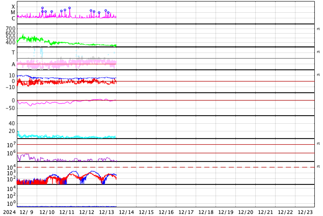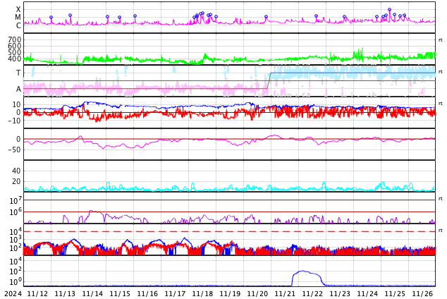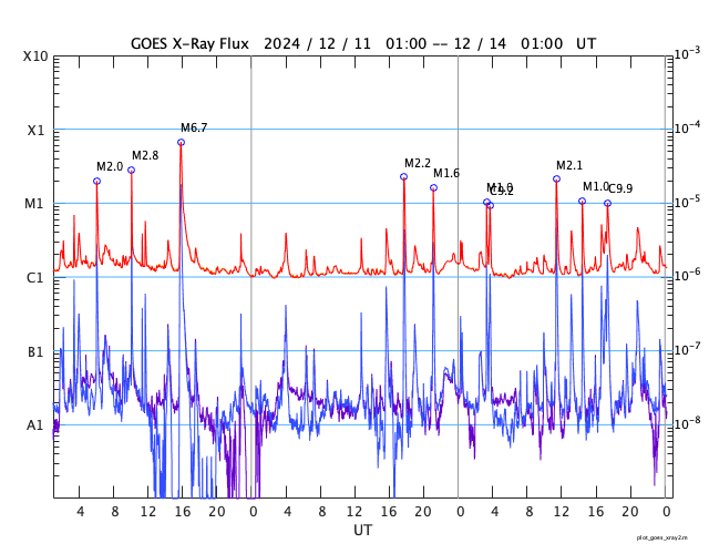 GOES衛星の太陽X線強度。赤・橙 = 0.1〜0.8 nm、青・紫 = 0.05〜0.4 nm (c) データ:NOAA/SWPC、作図:宇宙天気ニュース ![]() | ||||||||||||||||||||||||||||||||||||||||||||||||||||||||||||||||||||||||||||||||||||||||||||||||||||||||||||||||||||||||||||||||||||||||||||||||||||||||||||||||||||||||||||||||||||||||||||||||||||||||||||||||||||||||||||||||||||||||||||||||||||||||||||||||||||||||||||||