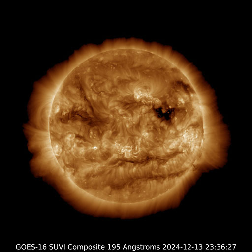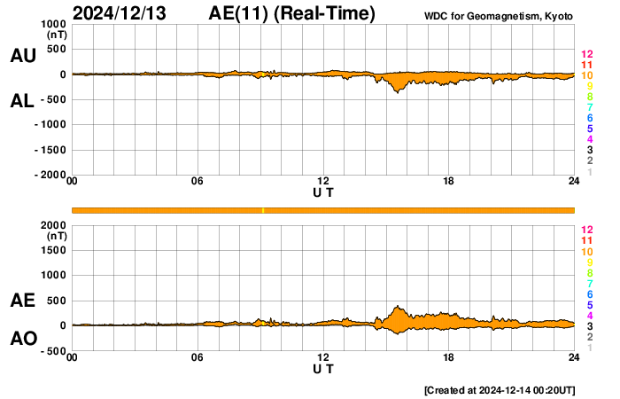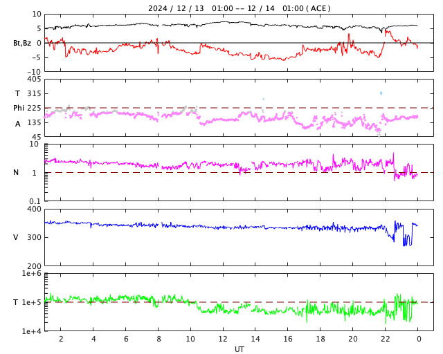 2024/12/14 09:24 更新 太陽風は低速の状態が続いています。磁気圏では弱い活動が発生しています。 担当 篠原 太陽風は、速度が350km/秒から330km/秒へ小幅ですが下がり、 より低速になっています。 磁場強度は、6nTと平均的な状態です。 磁場の南北成分は、弱い南寄りが続いています。 磁気圏では弱い活動が発生して、 AE指数は200〜300nTの小規模の変化がしばらく続いています。 GOES衛星SUVI 195では、 北半球のコロナホールは西側に進み、 これから影響が始まるかもしれません。 この後の太陽風の変化に注目して下さい。 太陽は、西の端(右端)に近付いた3917黒点群で、 M2.0の中規模フレアやC9.9の小規模フレアが発生し、 南東(左下)の3922群で、 M1.0の中規模フレアが2回発生しています。 この2つの領域である程度の活動が続いています。 ![]() GOES衛星SUVI 195による太陽コロナの様子。 (c) GOES衛星SUVI 195 (NOAA) ![]() 14日9時(世界時14日0時)に鹿児島で撮影した太陽。 (c) 宇宙天気ニュース ![]() ACEが観測した太陽風の磁場(黒線は全体の強度、赤線は南北成分) 磁場の向き、プラズマの密度、速度、温度 (c) データ:NOAA/SWPC、作図:宇宙天気ニュース ![]() AE指数(速報値) 下段のAEグラフの値が高くなると、オーロラ活動が活発化しています。 (c) 京都大学WDC ![]() ![]() 27日の太陽周期に合わせた図 太陽が同じ面を地球に向けていた27日前の変化から、今後を予想することができます。 (c) 作図:宇宙天気ニュース