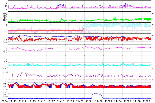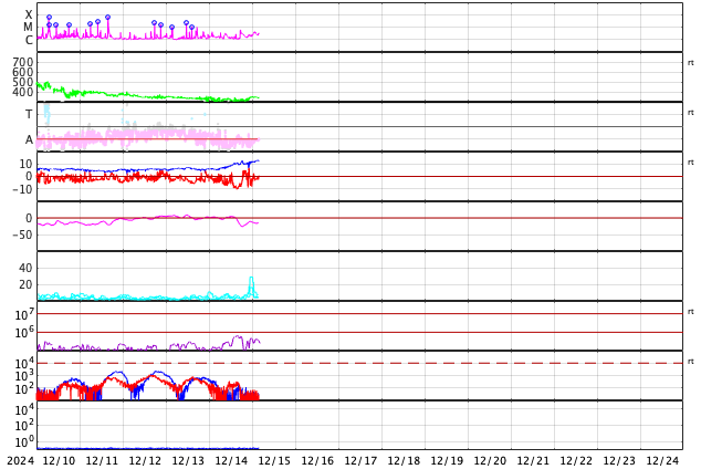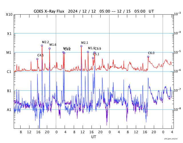 GOES衛星の太陽X線強度。赤・橙 = 0.1〜0.8 nm、青・紫 = 0.05〜0.4 nm (c) データ:NOAA/SWPC、作図:宇宙天気ニュース ![]() | ||||||||||||||||||||||||||||||||||||||||||||||||||||||||||||||||||||||||||||||||||||||||||||||||||||||||||||||||||||||||||||||||||||||||||||||||||||||||||||||||||||||||||||||||||||||||||||||||||||||||||||||||||||||||||||||||||||||||||||||||||||||||||||||||||||||||||