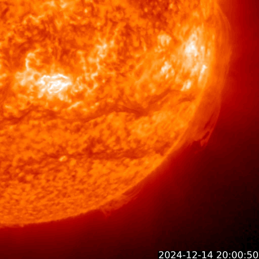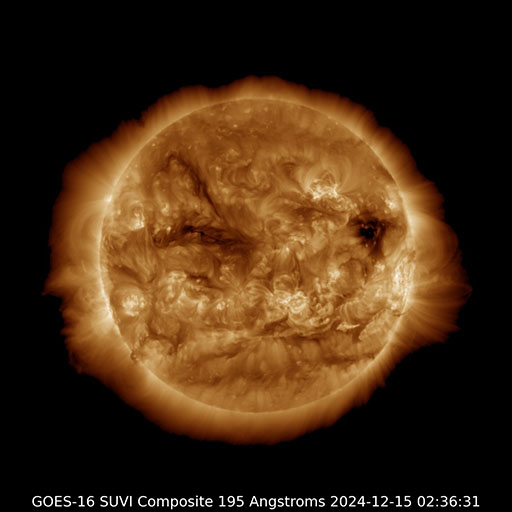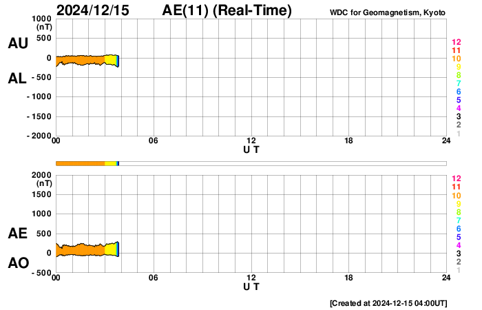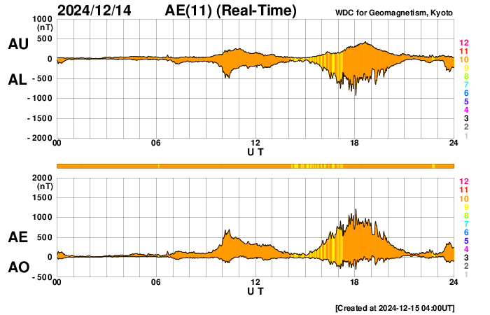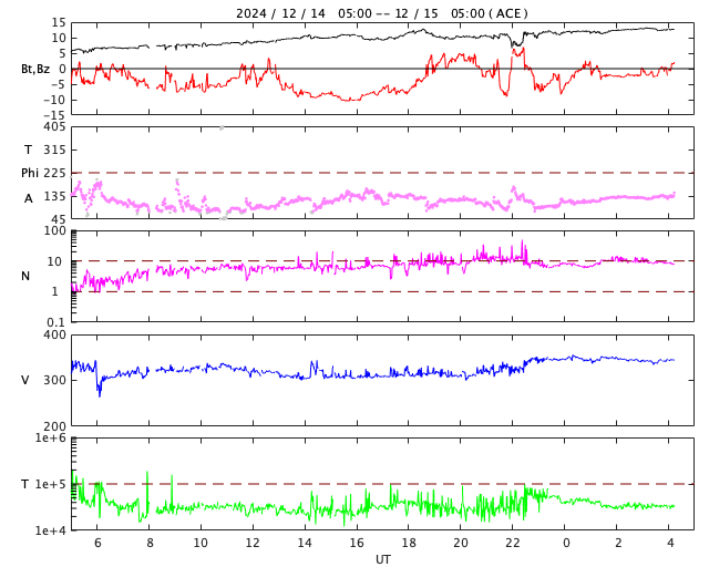 2024/12/15 13:21 更新 太陽風は低速の状態が続いています。磁場の南向きの強まりで、磁気圏の活動が強まりました。 担当 篠原 太陽風は、速度が310km/秒から340km/秒へ 少し上がる変化が見えていますが、低速の状態が続いています。 一方、磁場強度は、6nTと平均的な状態からゆっくりと強まって、 グラフの最後は13nTに達しています。 この後はどの様に推移するでしょうか。 太陽風磁場の南北成分は、 グラフの中盤で、-10nTに達する強い南向きが発生しています。 ここで磁気圏の活動が強まって、 AE指数は1000nTに達する大きい変化が発生しています。 その後は、磁場の南向きは弱まり、0nT付近で推移しています。 磁気圏の活動も小さくなり、AE指数の変化は小幅になっています。 GOES衛星SUVI 195の太陽コロナ写真では、 コロナホールが北西の端(右上)に近付いています。 太陽風の速度は、高まらないままになりそうです。 太陽は、南西(左下)の3924黒点群でC6.0の小規模フレアが発生した程度で、 フレアの発生は少なくなっています。 GOES衛星SUVI 304によると、 太陽の南西側で東西に長く伸びるフィラメントの噴出が発生しています。 SOHO衛星LASCO C2では、 太陽の右下へ広がるCME(コロナ質量放出)が観測されています。 ![]() 太陽の南西側で発生したフィラメント噴出。 (c) GOES衛星SUVI 304 (NOAA)、(動画加工 : 宇宙天気ニュース) ![]() 太陽の右下へ広がるCME。 (c) SOHO衛星LASCO C2 (ESA & NASA)、(動画加工 : 宇宙天気ニュース) ![]() GOES衛星SUVI 195による太陽コロナの様子。 (c) GOES衛星SUVI 195 (NOAA) ![]() 15日10時半(世界時15日1時半)に鹿児島で撮影した太陽。 (c) 宇宙天気ニュース ![]() ACEが観測した太陽風の磁場(黒線は全体の強度、赤線は南北成分) 磁場の向き、プラズマの密度、速度、温度 (c) データ:NOAA/SWPC、作図:宇宙天気ニュース ![]() AE指数(速報値) 下段のAEグラフの値が高くなると、オーロラ活動が活発化しています。 (c) 京都大学WDC ![]() ![]() 27日の太陽周期に合わせた図 太陽が同じ面を地球に向けていた27日前の変化から、今後を予想することができます。 (c) 作図:宇宙天気ニュース