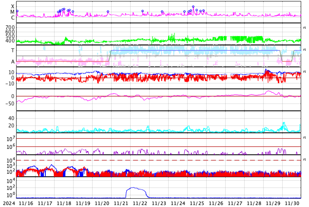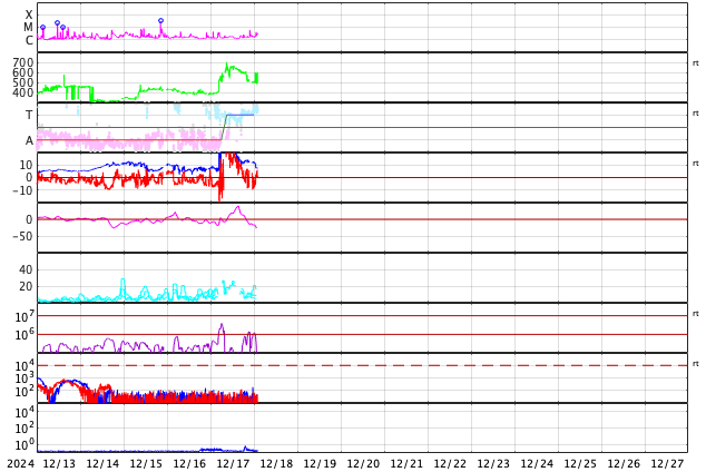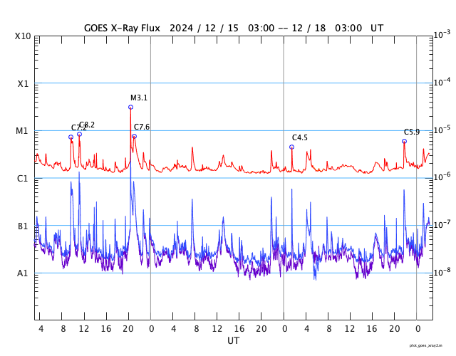 GOES衛星の太陽X線強度。赤・橙 = 0.1〜0.8 nm、青・紫 = 0.05〜0.4 nm (c) データ:NOAA/SWPC、作図:宇宙天気ニュース ![]() | ||||||||||||||||||||||||||||||||||||||||||||||||||||||||||||||||||||||||||||||||||||||||||||||||||||||||||||||||||||||||||||||||||||||||||||||||||||||||||||||||||||||||||||||||||||||||||||||||||||||||||||||||||||||||||||||||||||||||||||||||||||||||||||||