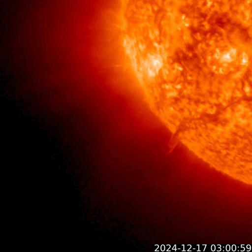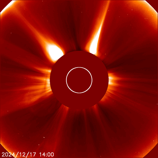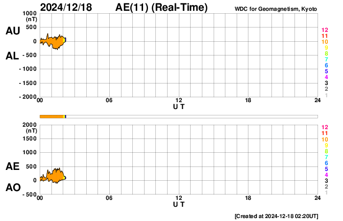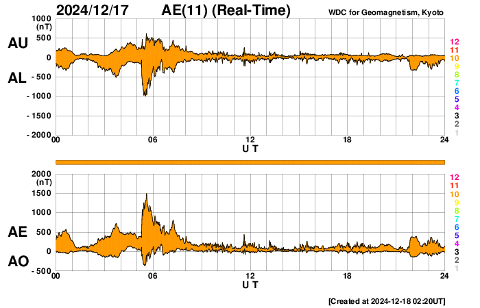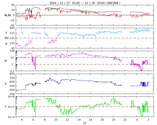 2024/12/18 11:37 更新 太陽風の急な乱れが到来しました。磁気圏活動は一時的な強まり程度です。 担当 篠原 昨日の昼過ぎ、17日13時40分(世界時17日4時40分)頃に、 太陽風の急な強まりがDSCOVR衛星で観測されました。 太陽風の速度は、400km/秒から550km/秒に高まり、 磁場強度は、6nTから25nTに強まっています。 15日のニュースでお知らせした、 15日7時(世界時14日22時)頃に太陽の南西側(右下)で発生した フィラメント噴出による太陽風の乱れではないかと思います。 この場合、およそ2日で地球へ達したことになります。 太陽風の速度は、夕方には660km/秒に高まりました。 深夜になると下がり始めて、 グラフの最後はやや不確かですが、500km/秒になっている様です。 現在も高速の状態は続いています。 磁場強度は、昨夜には低下が始まって、 今日に入る頃に10nTまで下がり、現在は8nTとやや強まった状態です。 磁場の南北成分は、乱れの到来直後は南向きに強まりましたが、 2時間程で北向きに切り替わったため、磁気圏への影響は限定的です。 AE指数は、17日14時(世界時17日5時)に 1500nTに達する大きい変化が発生していますが、 その後は変化が小さくなっています。 磁場の南北成分は、25nTという強い北向きも発生しています。 これが南向きだった場合は、 磁気圏の活動は激しくなっていたでしょう。 この後、太陽風は次第に穏やかな状態に戻りそうです。 太陽は、今朝、18日6時半(世界時17日21時半)に、 南東の端(左下)の少し向こう側で C5.9の小規模フレアが発生しました。 また、太陽の向こう側である程度規模の大きい活動が発生した様で、 18日1時(世界時17日16時)に、 太陽を丸く囲むように広がるハロー型の CME(コロナ質量放出)が発生しました。 SOHO衛星LASCO C2、C3の動画を掲載します。 太陽のこちら側では特に変化が起きていないので、 向こう側の現象です。 CMEの広がり方を見ると、活動がこちら側で発生した場合は、 太陽風の強い乱れがやって来たでしょう。 そして、これよりも前の現象ですが、 17日13時(世界時17日4時)と17日16時(世界時17日7時)に、 太陽の南東側でプロミネンス噴出が発生しています。 GOES衛星SUVI 304の動画を掲載します。 横向きの噴出なので、地球への影響はないでしょう。
