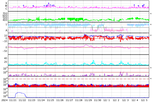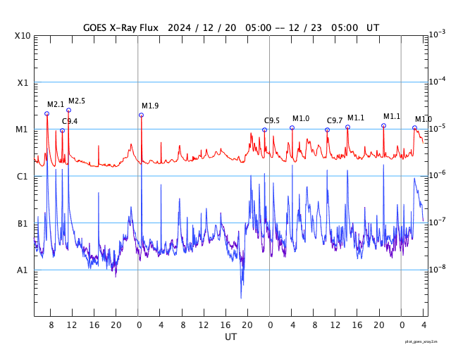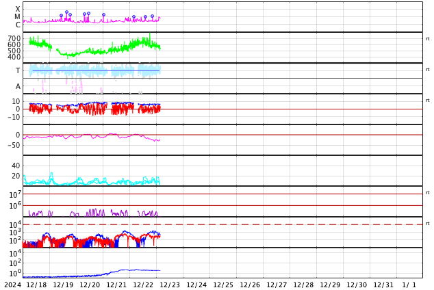 GOES衛星の太陽X線強度。赤・橙 = 0.1〜0.8 nm、青・紫 = 0.05〜0.4 nm (c) データ:NOAA/SWPC、作図:宇宙天気ニュース ![]() | |||||||||||||||||||||||||||||||||||||||||||||||||||||||||||||||||||||||||||||||||||||||||||||||||||||||||||||||||||||||||||||||||||||||||||||||||||||||||||||||||||||||||||||||||||||||||||||||||||||||||||||||||||||||||||||||||||||||||||||||||||||||||||||||||||||||||||||||||||||||||||||||||||||||||||||||||||||||||||||