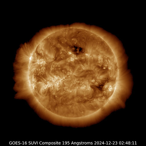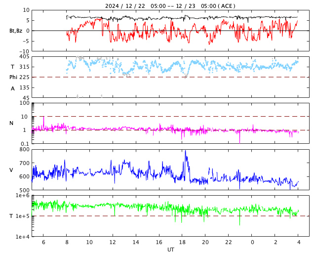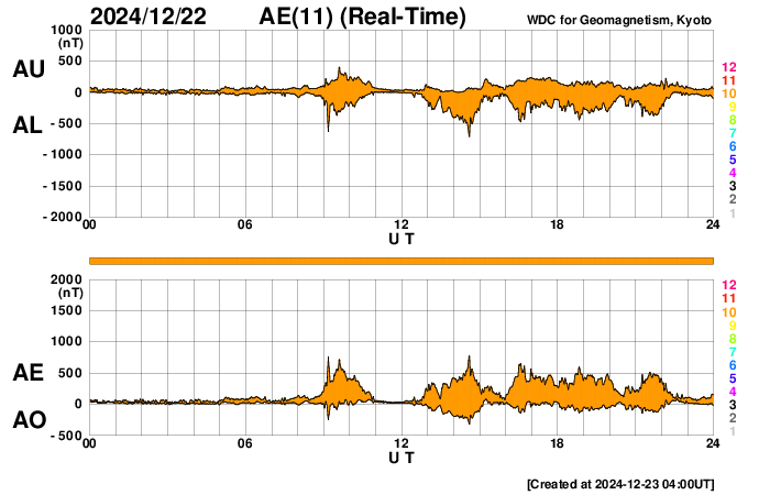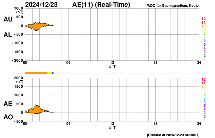 2024/12/23 13:12 更新 高速の太陽風が続いています。アイスランドのオーロラをどうぞ。 担当 篠原 アイスランドに滞在中の藤井哲也さんより、 現地12月22日19時5分 (世界時と同じです)に、 アイスランド北東部のミーヴァトン湖畔で撮影された オーロラの写真をいただきました。 現地はなかなな天候に恵まれないとのことで、 撮影に苦労されている様です。 太陽風は550km/秒くらいと高速で、 AE指数は500nTの中規模の変化が続いていた頃です。 北東の空を撮影している様です。 写真の右上にぎょしゃ座の五角形があり、 オーロラの光と重なる様にふたご座の2つの星が見えています。 地平線の赤い星は火星です。 暗くて見にくいですが、地上には白い雪が見えている様です。 日本時間では、今朝4時の撮影です。 最新の情報をどうもありがとうございます。 太陽風は、600km/秒から550km/秒へ少し下がっていますが、 高速の風が続いています。 磁場強度は、6〜7nTと平均的な値に戻りかけています。 磁場の南北成分は、南北に細かく変化しています。 磁気圏は活動的な状態が続き、 AE指数は、500〜700nTの中規模の変化が続いています。 GOES衛星SUVI 195で見えていた コロナホールは小さかったのですが、 高速太陽風はどこまで続くでしょうか。 太陽は、3日ぶりに可視光写真を掲載しています。 南東(左下)の3932黒点群でC9.6、M1.1、 南西(右下)の3930群でM1.0などの 小規模、中規模フレアが発生し、 先程、23日11時(世界時23日2時)には、 北東の端の少し向こう側(左上)で、 M1.0の中規模フレアが発生しています。 週末の停電から無事に回復できた様です。 この記事が見えていれば、ネットワークも元に戻っています。